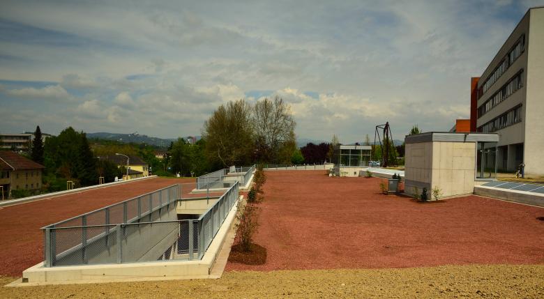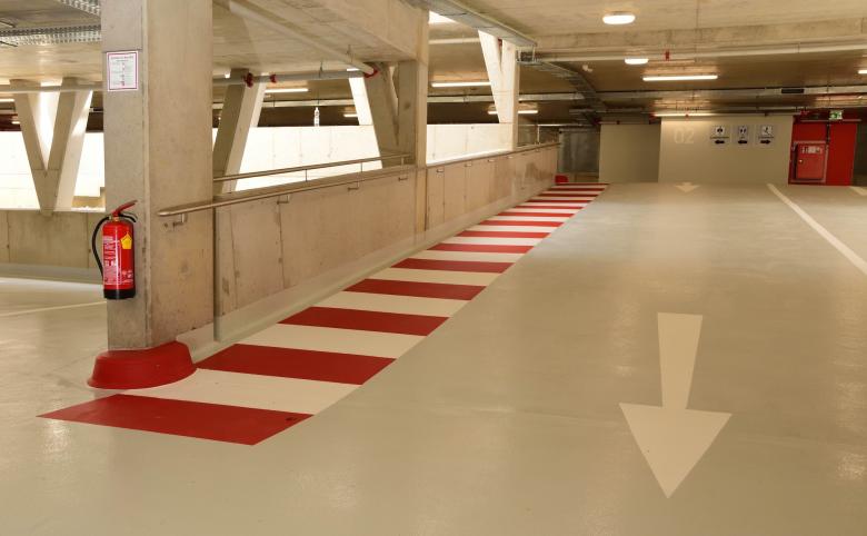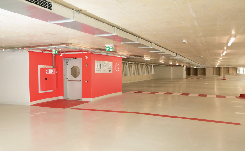 Zwei Lüftungsschlitze entlang der äusseren Achsen ergänzen die natürliche Querlüftung beider Gebäudeteile. Über einen ebenen Zugang von der Aufschliessungsstrasse aus wird die oberste Parkebene erschlossen. Die gesamte Konstruktion wird aus Stahlbeton (Decken) bzw. Stahlverbundkonstruktion (Säulen) hergestellt EI 60. Leichte Betondecke mittels Hohlkörper als verlorene Schalung dort wo die geringste Wirkung erbracht wird.