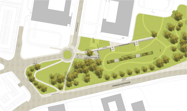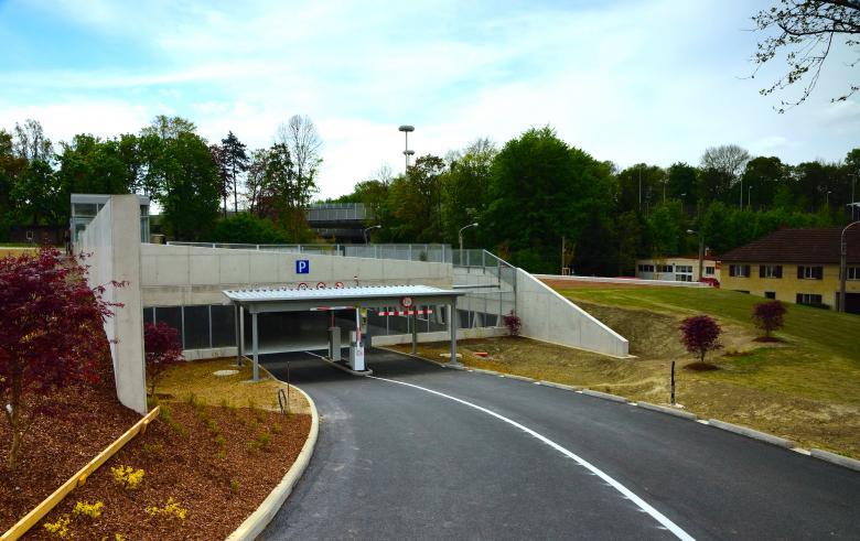 Die Garage besteht aus zwei 16,0 m breiten und ca. 70,0 m langen Baukörpern, die durch ein 5,0 m breites Atrium getrennt sind. Sie sind in der Höhe um ein halbes Geschoss versetzt. Mittels D`Humy Rampen sind die verschiedenen Niveaus miteinander verbunden. Dieses System integriert sich daher gut in die bestehende Topographie des Hanges. Um die Orientierbarkeit, natürliche Belüftung und Belichtung zu gewährleisten, ist entlang der Längsachse ein Atrium zwischen den Parkebenen situiert.
