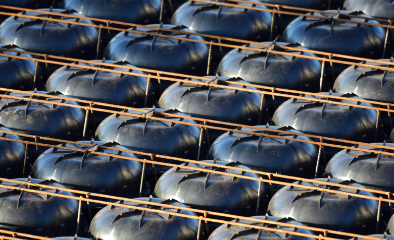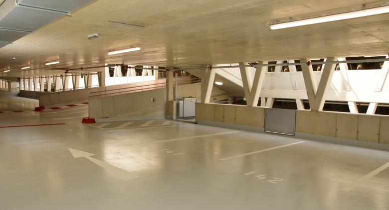 Spannweiten bis 20.0m mit ebener Untersicht und einer Gewichtsreduktion von 35 % bei einer Deckenstärke von 50cm sind möglich. Die gesamte Garage mit den vier versetzten Längsebenen (HDD/Hohlkörperdecken) ist stützenfrei. Die schräge Stützenausführung dient gleichzeitig der vertikalen Längsaussteifung.