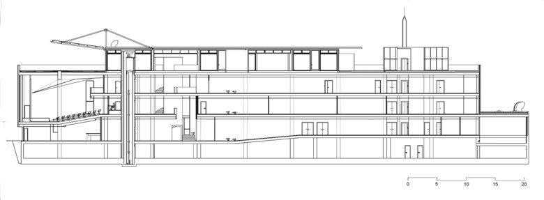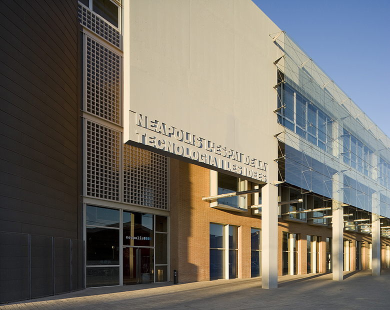 The programme posited by the Town Council of Vilanova i La Geltrú proposed a building for various local communications services: the local TV and radio stations, a 200 seat conference hall, a cybercafé, a multiuse space suitable for exhibitions, premises for various communications technology activities and classrooms for occasional use within programmes as yet to be defined. Such a programme corresponds to a large container, functionally neutral in order to permit flexibility of use, and the form of the building therefore attends in the first instance to urbanistic considerations: a space with an oval plan that resolves the junction of Rambla de l’Exposició and Av. Eduard Toldrà and a trapezoidal space that adapts to the architectural order of the Rambla and offers a façade to the garden to the rear. Despite the primarily functional mentality, these volumes serve to indicate a first classification of uses, with the cybercafé and conference hall being located in the first volume and the TV and radio stations and the experimentation, educational and exhibition spaces in the second. The first is a very opaque container clad with aluminium panels and the second is a brickwork volume with modular windows rectangular that, on the S façade, are protected by a screen of etched glass that also serves to mark the volumetric and spatial continuity of the portico, a building-regulation requirement on the Rambla. Between the two volumes is the transverse access vestibule that rises through all three floors to afford a comprehensive vision of the whole complex and create a representative public image.