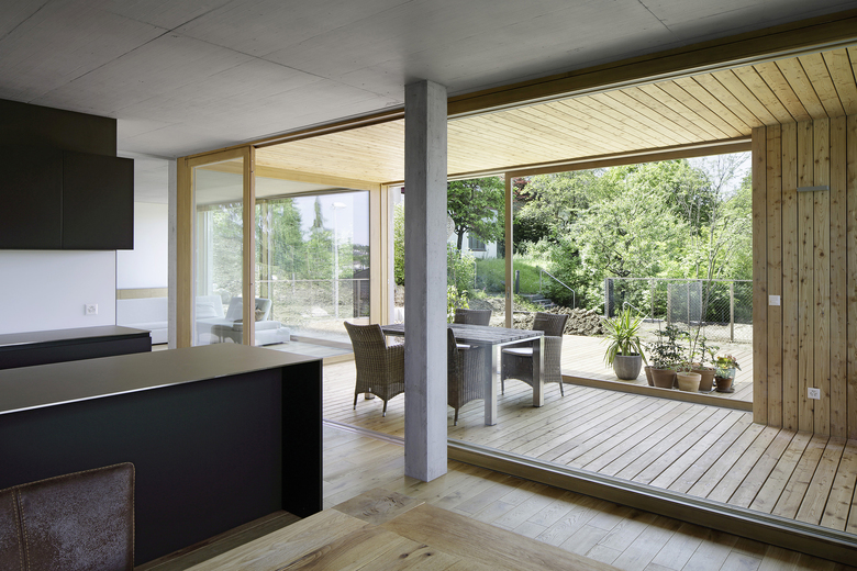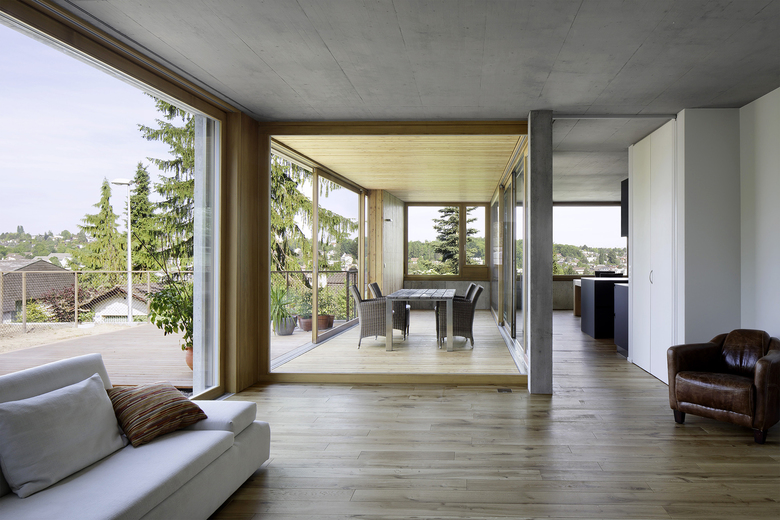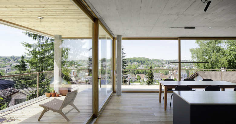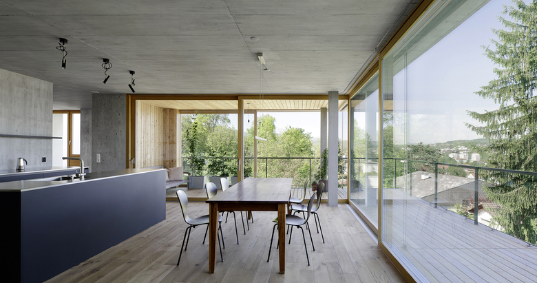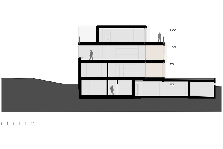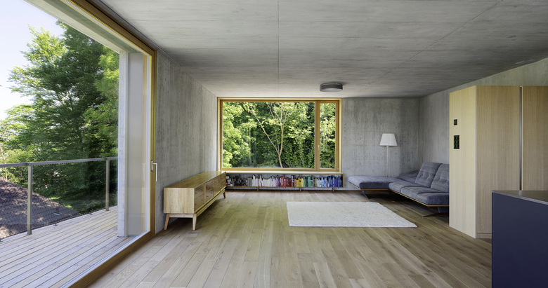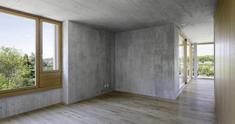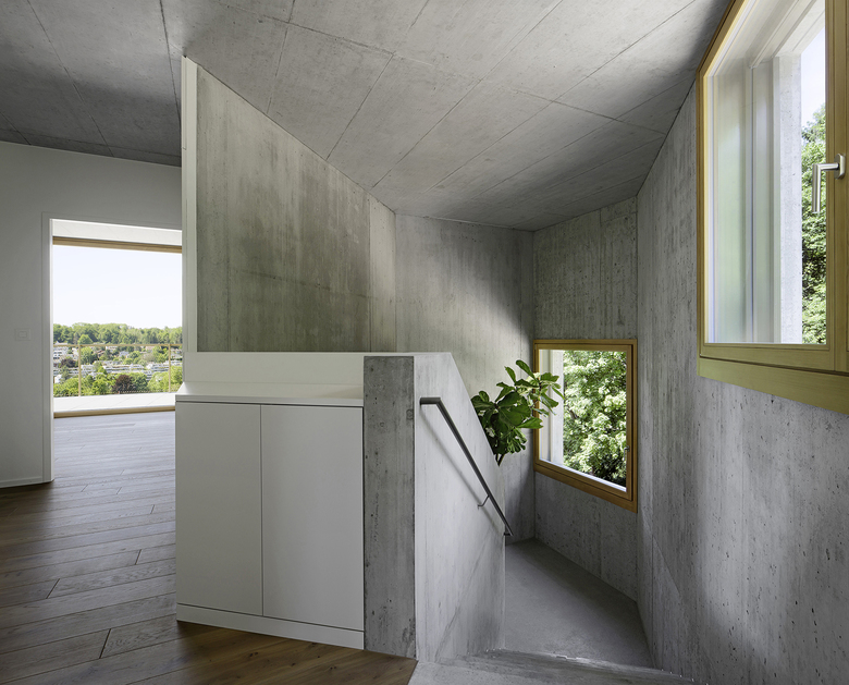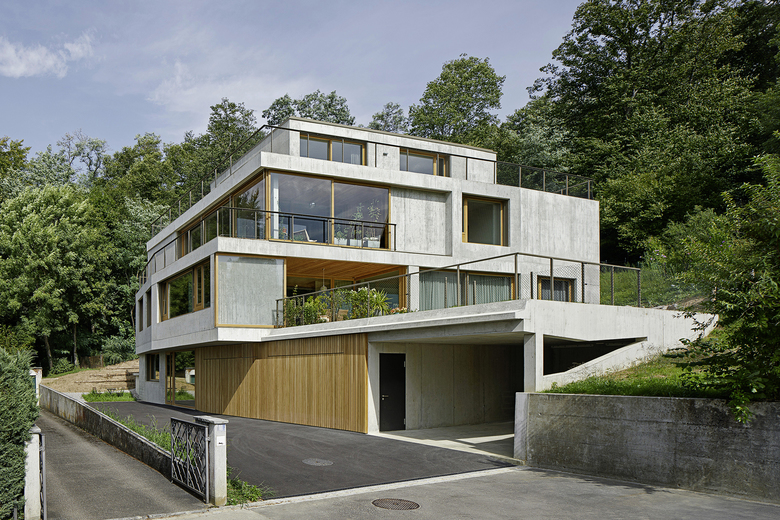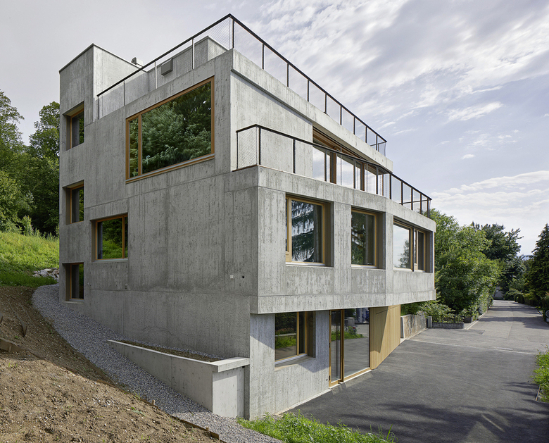 Entstehen soll ein Mehrfamilienhaus, das Platz für zwei bis drei Parteien bietet. Charakteristisch für das projektierte Gebäude ist das talseitig zum Vorschein tretende Sockelgeschoss (Untergeschoss), welches die Vorfahrt mit Eingang und Einstellplätze von den darüber liegenden privaten Wohneinheiten trennt. Über dem Sockelgeschoss befinden sich zwei Vollgeschosse und ein Attikageschoss. Dank der grosszügigen Schiebefenster im Wintergarten, welche sich vollständig vor die zurückversetzten Wandflächen schieben lassen, entsteht ein kontinuierlicher Raum zu Wintergarten und Garten. Die räumlichen Übergänge von Innen und Aussen verwischen. Im Gegensatz dazu sind die Rückfassaden mit Schlafräumen und Treppenhaus geschlossen gehalten. Holzbeläge innerhalb der Wohnungen und im Wintergarten, Holzfenster sowie die Holzlattung der Garagenfront im Sockel bilden einen warmen Kontrast zur Betonfassade.