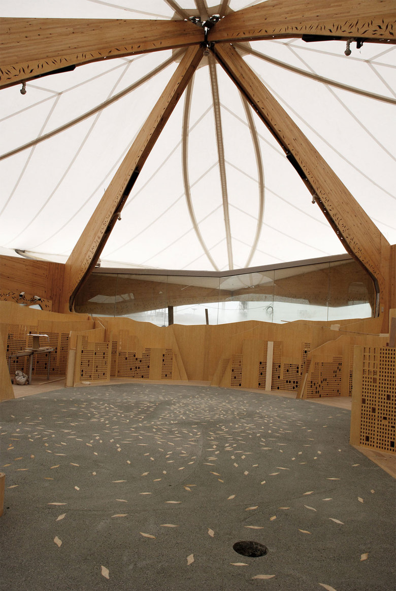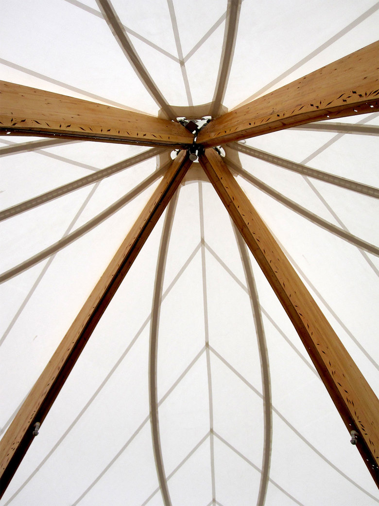 Die Tragkonstruktion des Pavillons besteht aus 15 Baumelementen. Diese Brettschichtholzkonstruktionen sind mit einer Membran aus PTFE überspannt. Die Membran überdacht eine Fläche von 2.500 m². Die maximale Spannweite beträgt 11 Meter.