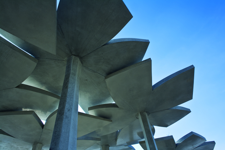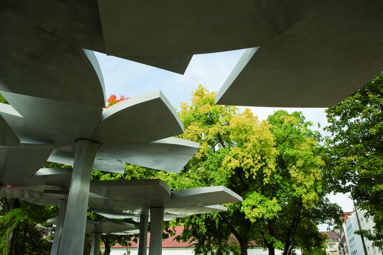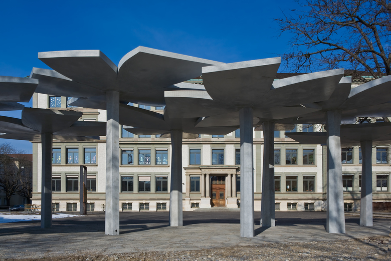 spielerische Komponente aufweist. Aus Stütze und Dach entstanden palmenähnliche Figuren, die sich überlappend zu einer Überdachung zusammenfügen. Die Auflösung des Daches zu freistehenden Einzelelementen in einer freien Formation entzieht sich jeglicher baulicher Bezüge und vermag unabhängig von äusseren Gestaltungselementen zu bestehen, ohne sich an das Schulhaus orientieren zu müssen oder die Spielplätze und Bäume zu konkurrenzieren. Je nach Wetterlage wird die Bedachung zum Spielinstrument mit interessanten Formen, Schatten- und Wasserspiel.