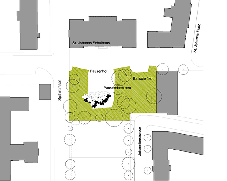 Der Pausenhof des Schulhauses St. Johann entspricht nicht mehr den heutigen Bedürfnissen. Er soll umgestaltet und ein überdachter Aussenbereich erstellt werden (Pausendach). Die Freiflächensituation bildet einen Knotenpunkt, auf dem Strassen, Plätze bzw. Parkanlagen zusammenstossen. Eine Bedachung an dieser