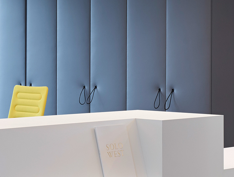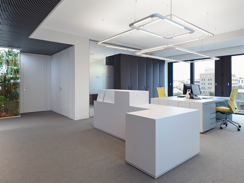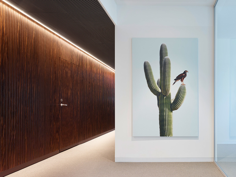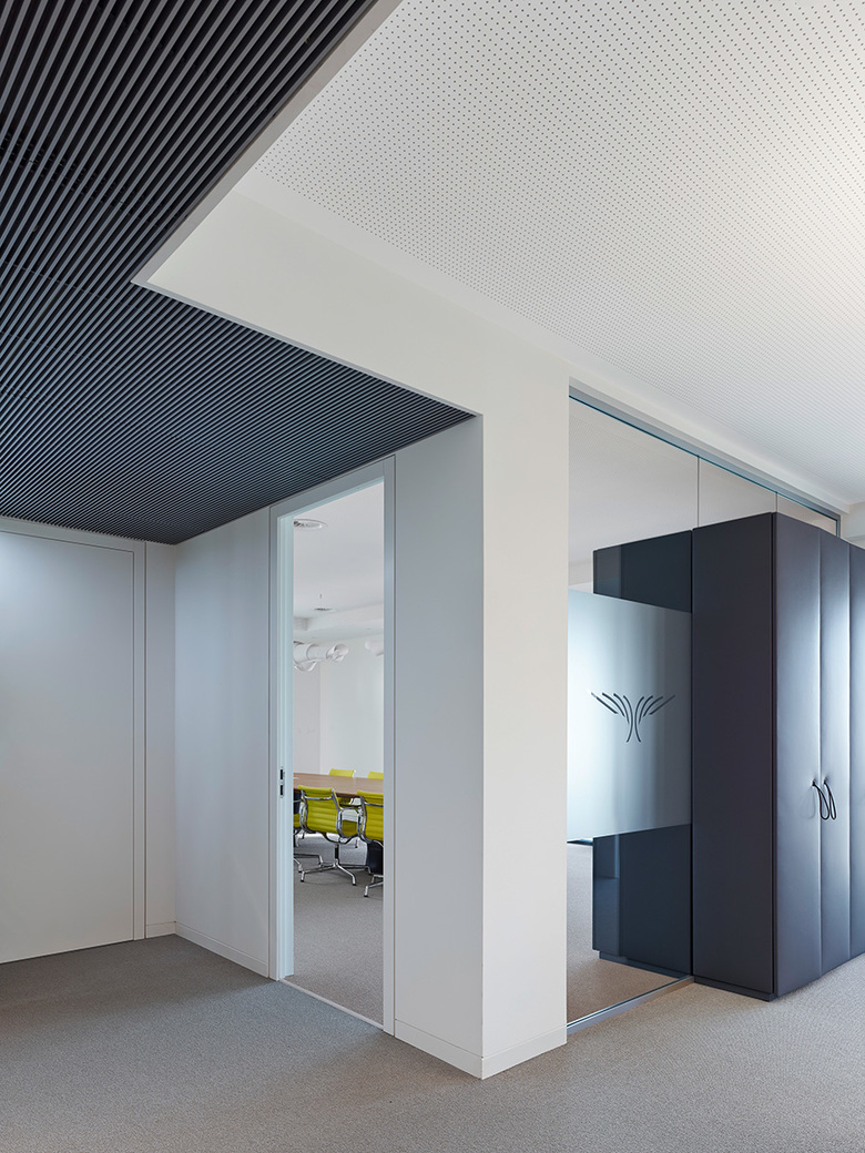 Die sich vom Empfang erschließenden Räume sind nicht hermetisch geschlossen, sondern bleiben durch die Vitrinen und raumhohe Glasfassaden einsehbar. Mit akustisch absorbierenden mikroperforierten Kunstleder bezogene Schränke vor den Glaswänden bilden eine weitere Schicht.