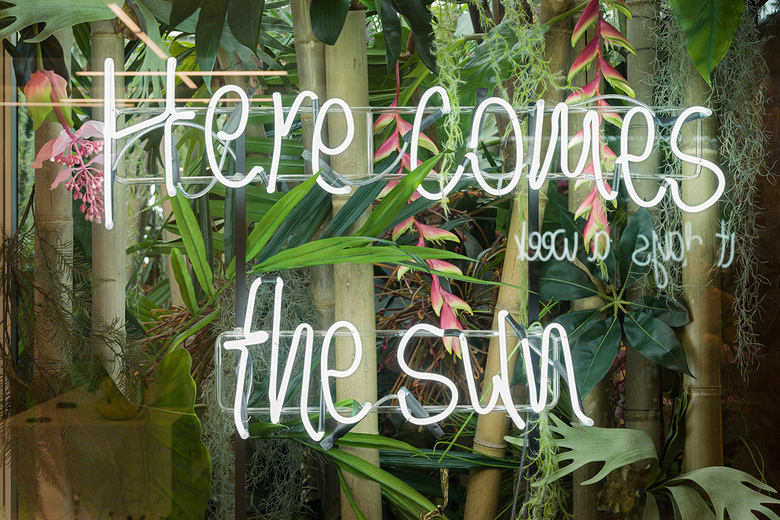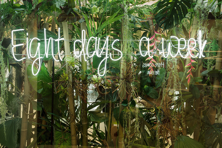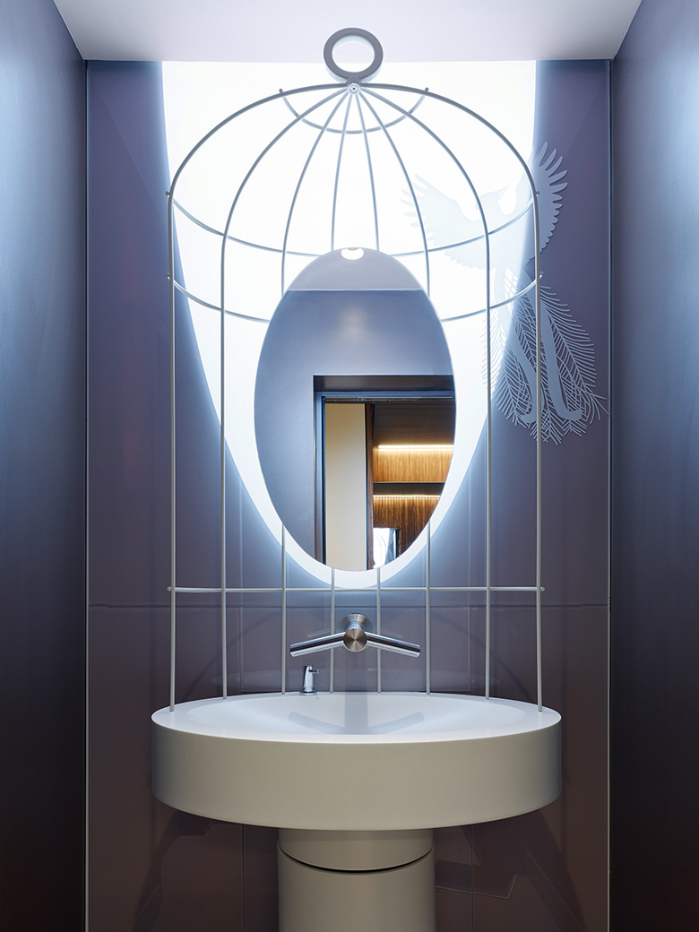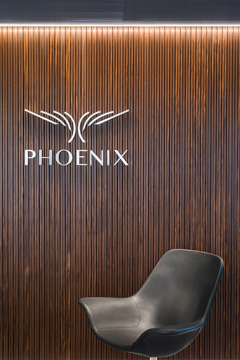 Vor dieser perfekt inszenierten Kunstblumenszenerie schwebt in Neonschrift ein Zitat aus einem Beatles-Song jeweils passend zum Raum: »Eight days a week« im Büro des Chefs, »We can work it out« in den Konferenzräumen und »Here comes the sun« vor dem Sekretariat. Das Beatles-Thema verweist auf eine Anekdote aus den Gründungstagen der Firma, als sich alle vier Geschäftsführer im Spaß in einem der Bandmitglieder wiedererkannten. Ein weiteres Beispiel für den verschmitzten Blick auf die Firma findet sich in den WCs, wo ein Phoenix aus einem stilisierten Käfig in den Lichtkegel auf der hinterleuchteten Wand aufsteigt.