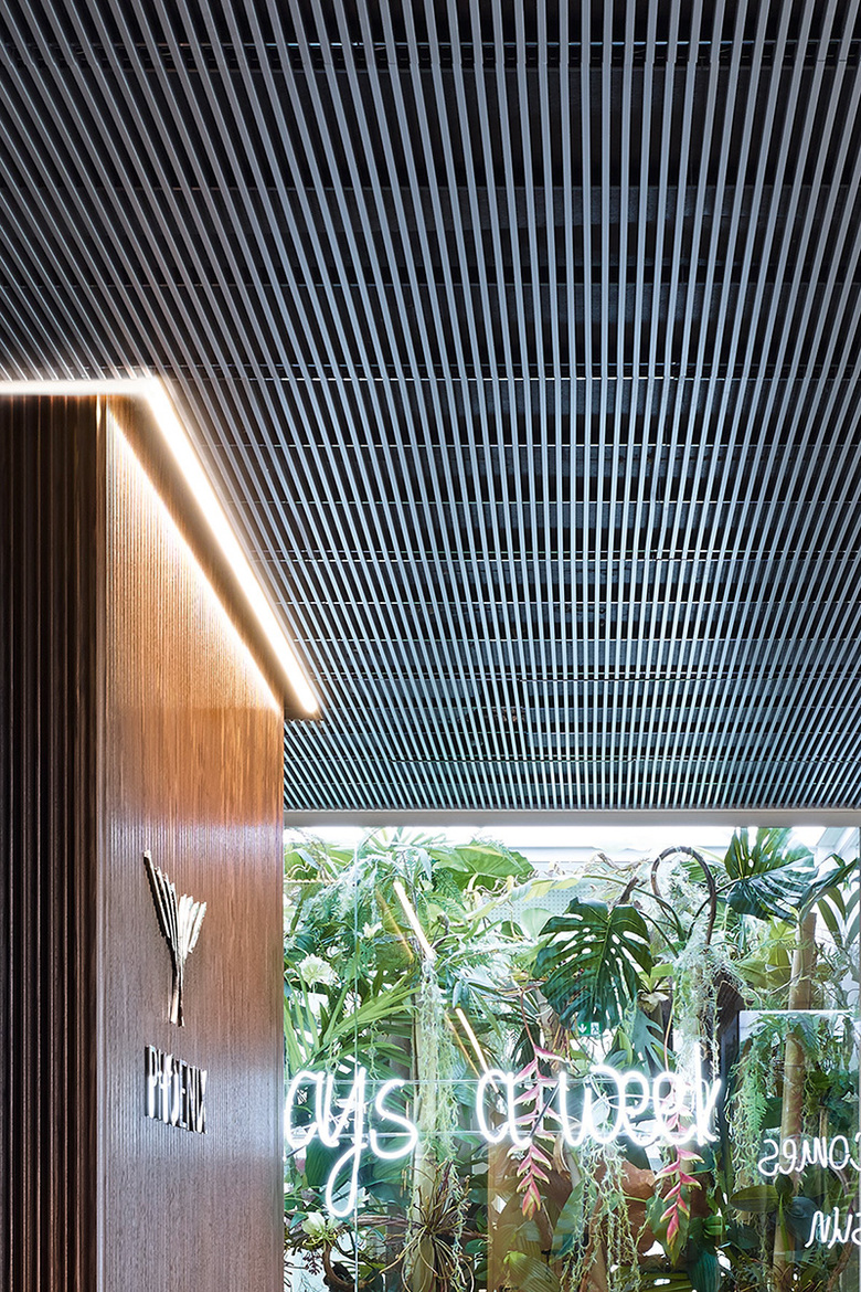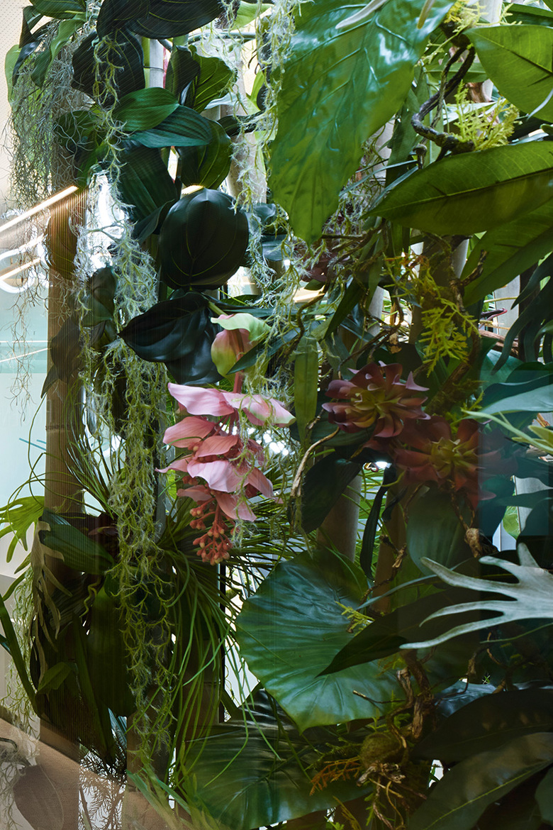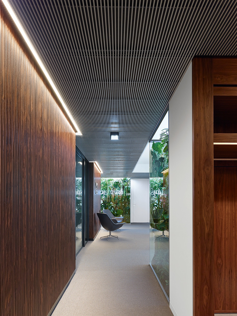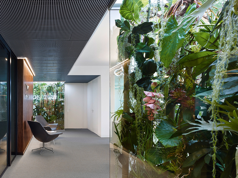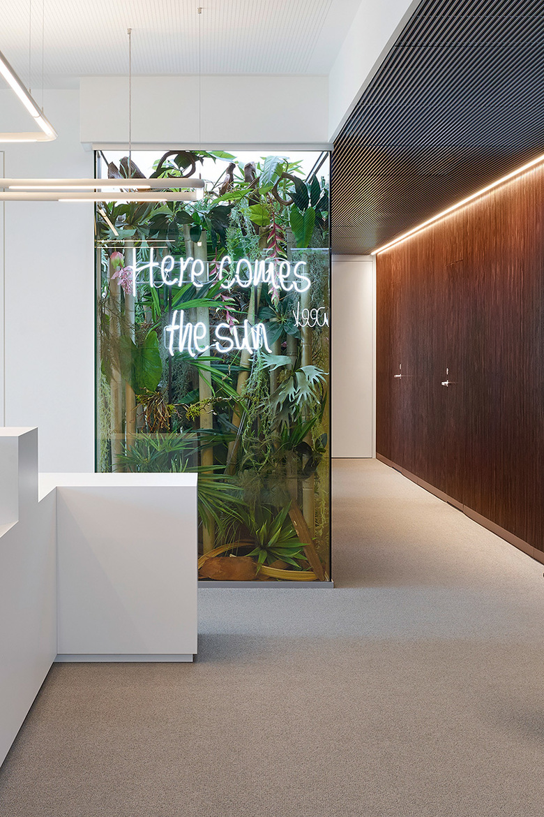 Das Büro präsentiert sich offen und hochwertig. Die klare und weißgrundige Büroarchitektur kontrastiert spannungsreich mit den warmen Holzflächen der Kernverkleidung. Diese Wirkung wird durch drei Vitrinen, opulent gefüllt mit tropischer, dschungelgleicher Vegetation, noch verstärkt. Neben ihrer überraschenden und dekorativen Wirkung dienen sie auch als augenzwinkernder Verweis auf die Prozesse der Branche an sich, als auch auf die Sehnsüchte und Hoffnungen der Entwickler und Kunden durch die zu entwickelnden Projekte.