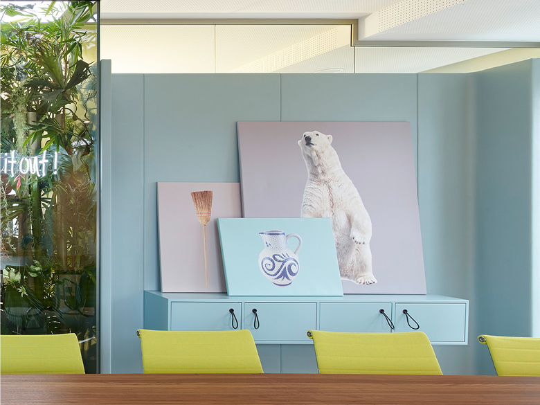 Für die Bespielung der Wände in den Büros wurde eine Serie großformatiger Fotos zusammengestellt. Die stark assoziativen Motive referenzieren auf das Selbstbild der Firma (ein kleiner Vogel, der große Probleme wie den Kaktus bewältigt), ihre Herkunft (der Besen als Synonym für die Kehrwoche in Stuttgart als Verweis auf den Stammsitz) oder ihr Business (Chuck Norris, der Eisbär). Die meisten Fotos sind nicht fest installiert und können zu immer neuen »Bühnenbildern« in den einzelnen Räumen kombiniert werden.