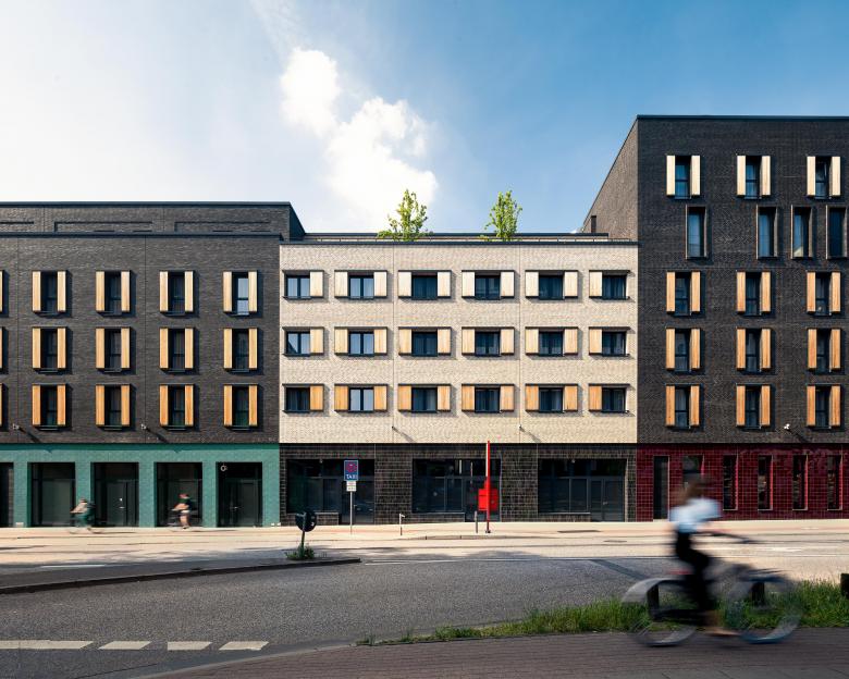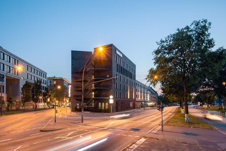 Der vier- bis sechsgeschossige Neubau für das Hotel Premier Inn ist im Herzen von Sankt Pauli entstanden. Der Stadtteil in Hamburg ist bekannt für sein lebhaftes Nachtleben und seine vielfältige kulturelle Szene. Die Fassade des Neubaus ist eine Hommage an das Flair des New Yorks der 1950er Jahre. Durch seine vielschichtige Gestaltung fügt sich das Hotel harmonisch in die Umgebung ein und spiegelt mit der abwechslungsreichen Material- und Farbgebung die Vielfalt des Viertels wider. Besonders auffällig ist die Stahltreppe an der Eckfassade des Gebäudes, die an die Feuerleitern New Yorks erinnert und als Balkonelement dient.