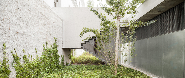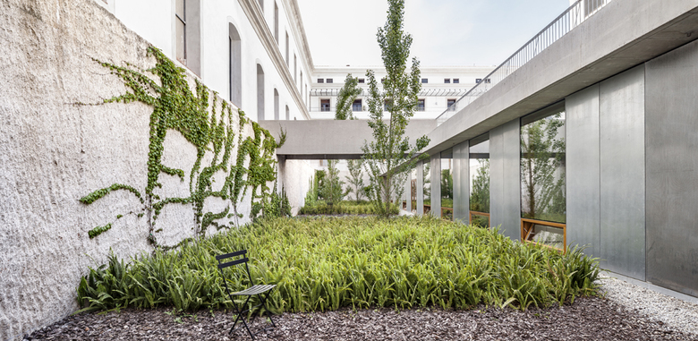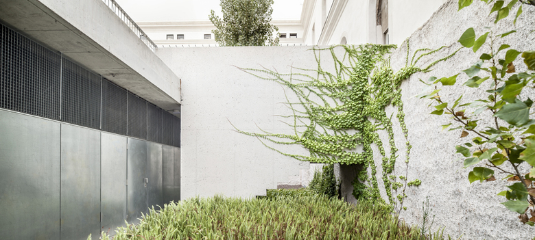 Emptying the central courtyard implies supporting the existent buildings by means of reinforced concrete screen walls around its perimeter. These walls are braced using reinforced concrete walkways which connect the buildings around the perimeter with the central square. In turn, the square acts as the roof of the buried facility. The entire structure is made of exposed concrete and all exterior walls are lightweight. External finishes are made of galvanized steel, whereas internal are made with paintable MDF boards. All external woodworks are made of laminated pine wood.