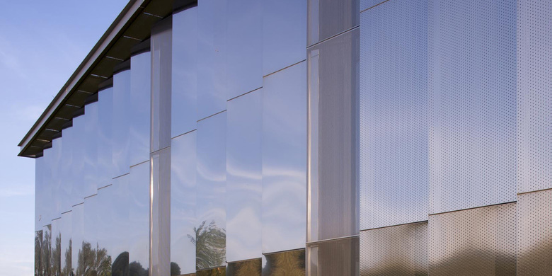 Le rapport au paysage, qui est un des thèmes principaux du projet avec celui du traitement de la lumière naturelle, s’exprime aussi dans le choix des matériaux. Le revêtement des façades de la halle d’exposition, en plaques d’acier inox réfléchissant, évoque un des matériaux composant les machines produites par l’entreprise, à la fois qu’il renvoie à son environnement champêtre et industriel dont il réfléchit l’image.