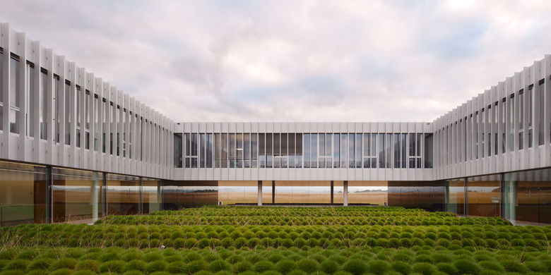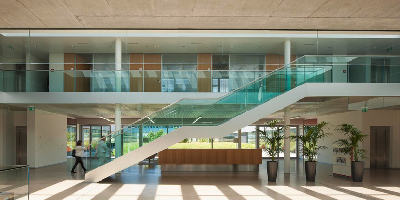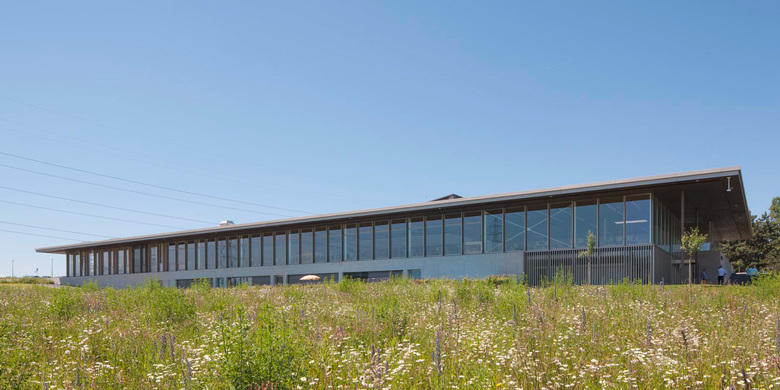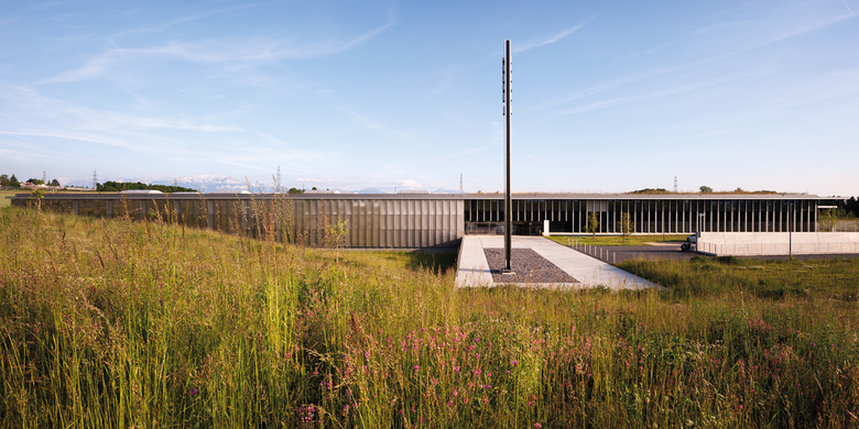 La figure horizontale du bâtiment, renforcée par la ligne de l’avant toit, se projette sur le paysage, contrastant avec les ondulations naturelles du terrain. Cette horizontalité est accentuée par l’axe de la « Promenade des Alpes » aménagée par l’Atelier du Paysage, composée d’un bassin en pierre naturelle qui longe la promenade, et qui se prolonge par une généreuse rampe conduisant à l’entrée principale. Cette promenade joue le rôle de véritable colonne vertébrale paysagère structurant l’ensemble du site.