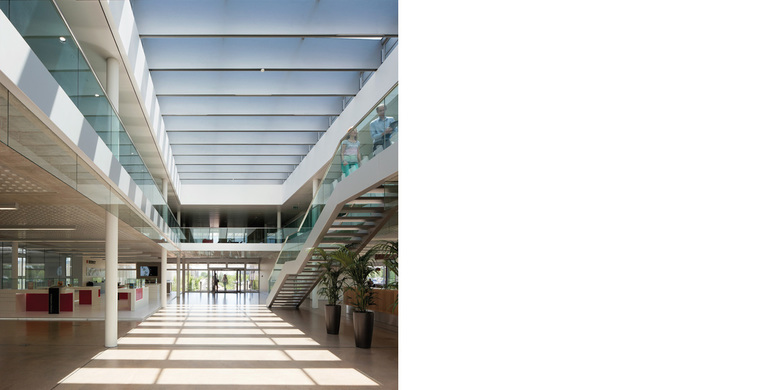 Le long bâtiment principal s’inscrit comme une référence linéaire dans le paysage environnant, sous la forme d’un grand toit abritant des programmes divers: d’un côté la grande halle d’exposition du Showroom, et à l’opposé les bureaux et salles de conférence du Siège. Le hall d’entrée avec son atrium en double hauteur articule et offre une vision sur ces deux parties: la halle d’exposition d’une part, les bureaux et fonctions publiques organisés autour d’une cour-jardin ouverte sur le paysage proche et lointain, d’autre part.