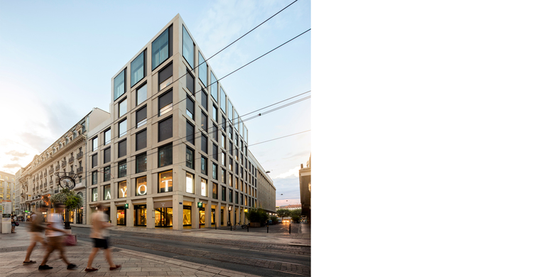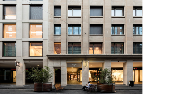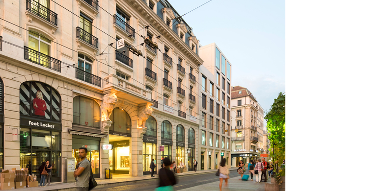 Dans un ensemble aux qualités techniques, architecturales, historiques et patrimoniales disparates, le projet offre un éventail complet de types et de niveaux d’intervention : un bâtiment est supprimé, un immeuble est démoli et reconstruit, dans le palais bancaire les façades sont maintenues alors que les dalles existantes, fragilisées par des interventions successives, sont reconstruites, deux bâtiments sont rénovés (changement des fenêtres, isolation des façades et rénovation intérieure), alors que pour le Passage des Lions, l’intervention cherche à préserver le maximum de substance de la construction initiale et à restaurer dans l’esprit d’origine les éléments remplacés.