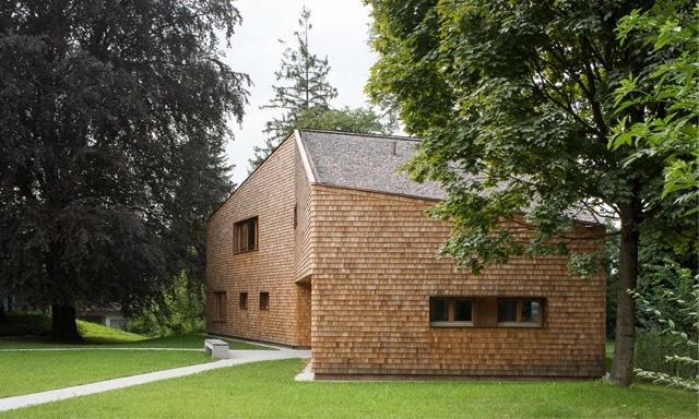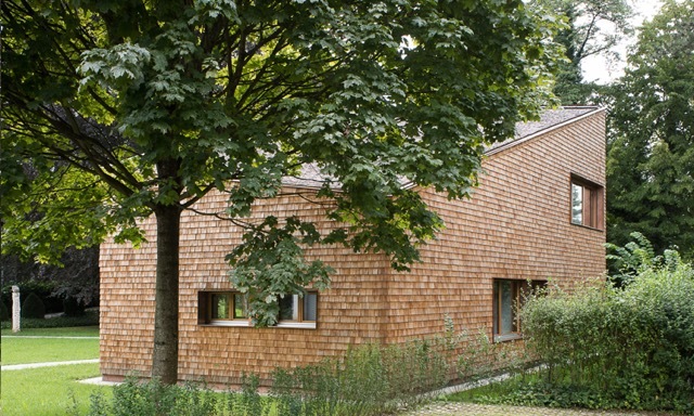 Die Aussenhaut und die Dacheindeckung des Gebäudes, das als vorfabrizierter Holzrahmenelementbau hergestellt wurde, sind mit naturbelassenen Holzschindeln aus Lärchenholz verkleidet.