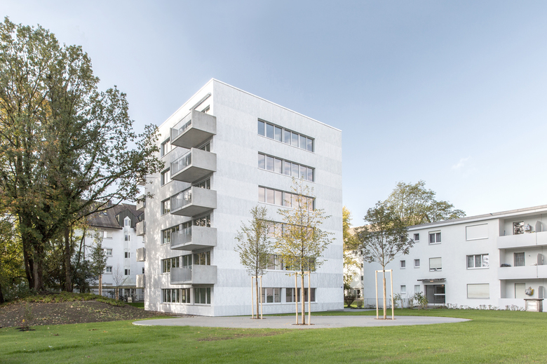 Im Rahmen einer Nachverdichtung ergänzte RLC im Winterthurer Stadtteil Töss gekonnt eine bestehende Arealüberbauung aus den 60er Jahren. Die ursprüngliche Bebauung bestand aus einem 7- und 3-geschossigen Gebäude. Beide Volumen bildeten einen offenen Hof, welcher jedoch wenig attraktiv in Erscheinung trat. Die Ergänzung mit dem exakt positionierten Neubau, unter dem Thema «Wohnen im Park», ergibt eine spannungsvolle städtebauliche Situation, die den Hof räumlich stärker fasst. Dieser erfährt eine deutliche Aufwertung durch den Erhalt der vorgefundenen Hügelkuppe mit der mächtigen Eiche, der Begrünung des bestehenden Tiefgaragendachs sowie dem Pflanzen zusätzlicher Bäume.
