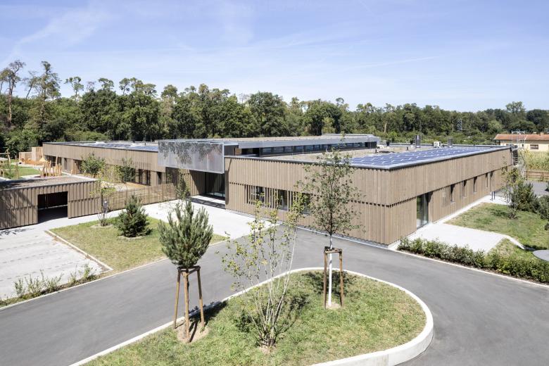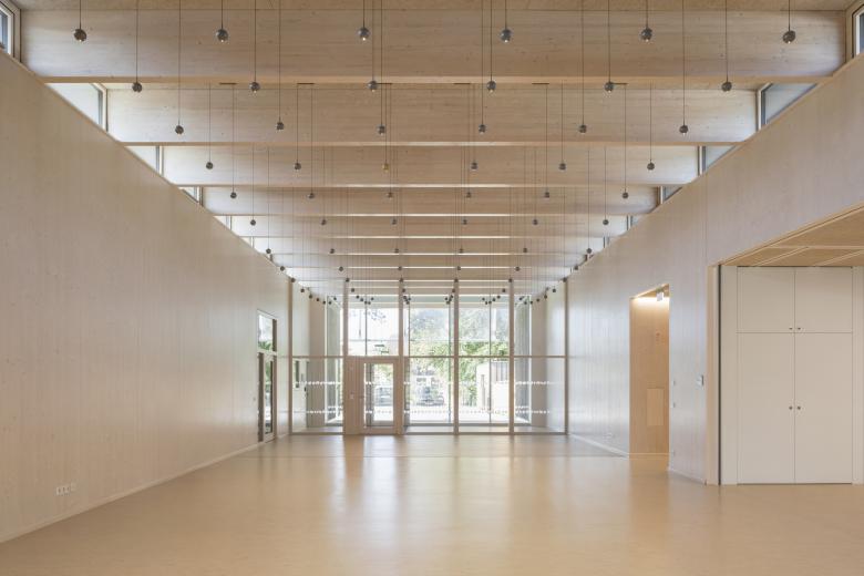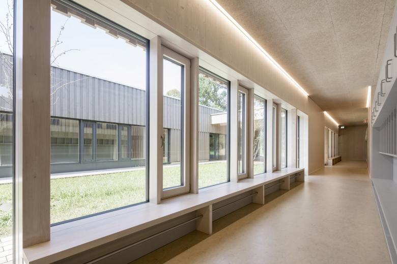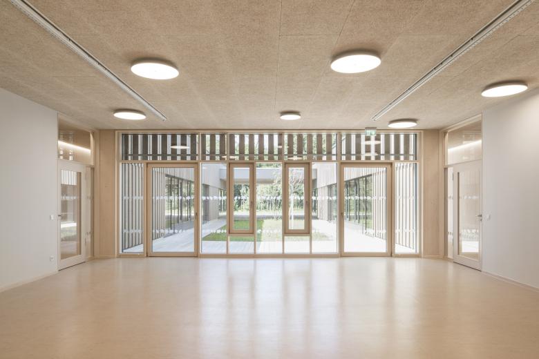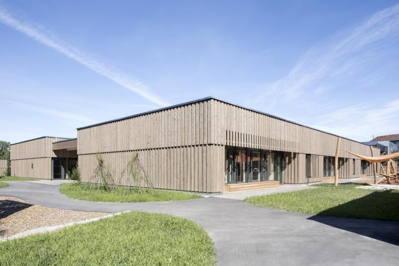Der eingeschossige Baukörper fügt sich harmonisch in die offene Landschaft am Ortsrand von Walldorf ein. Die jeweils drei Kindergarten- und Kinderkrippengruppen sind in den beiden Flügeln untergebracht, die in der Mitte durch einen gemeinsamen Innenhof, der als Einschnitt ausgebildet ist, verbunden sind. Vom gemeinschaftlichen Foyerbereich, der in die Aula übergeht, können alle weiteren Funktionsbereiche erschlossen werden.