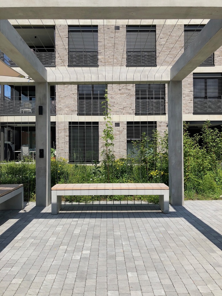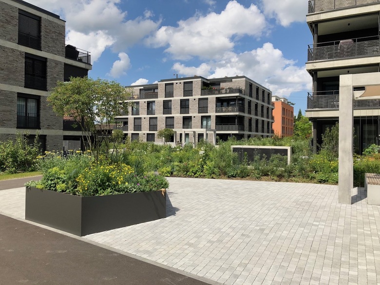 Geplant sind vier viergeschossige Mehrfamilien- häuser mit 68 Mietwohnungen. Die Baukörper sind kompakt und die Grundrisses effizient ent- worfen, sodass diese nachhaltig und kostengünstig erstellt werden können. Die einfache Statik unterstützt dies. Das Wegnetz schliesst an die bestehenden Struk- turen an und gewährt mit Geländemodellierungen sowie Bepflanzungen die Privatsphäre der erdgeschossigen Wohnungen.