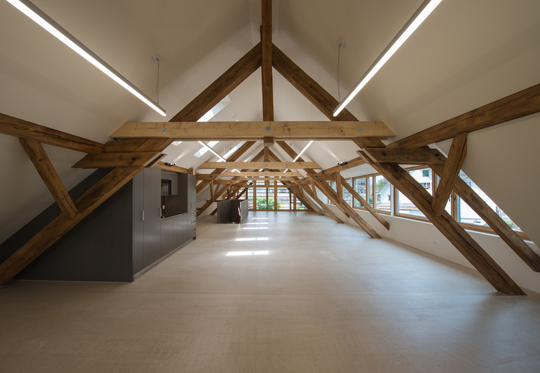 Der Dachstuhl konnte mit minimalen Eingriffen vom Brettlager zu einer Büronutzung weiterentwickelt werden. Die lange, lichtbringende Gaube erscheint dabei als klar zugefügtes, neuzeitliches Elemente.