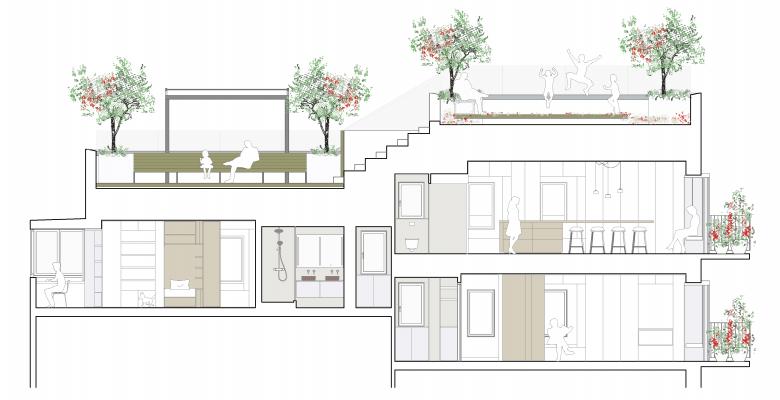 To start, all the interior walls of the apartment, which is organized on 3 split levels, were removed. The facade slab to the public staircase connects the different levels of the flat. A generous skylight above the interior staircase floods the apartment with light and creates a visual connection to the terraces.