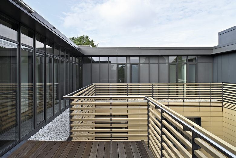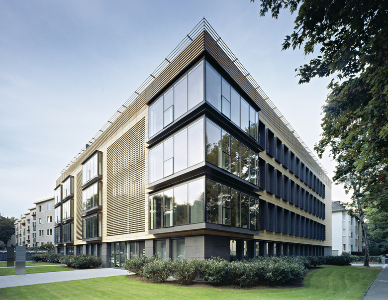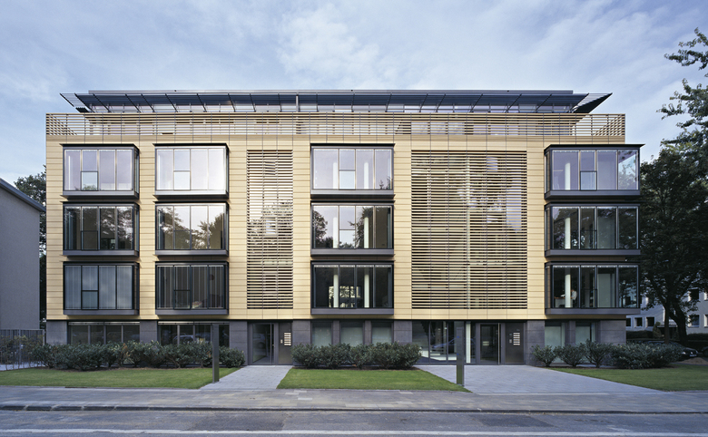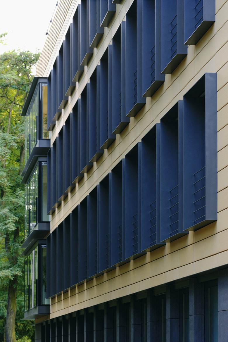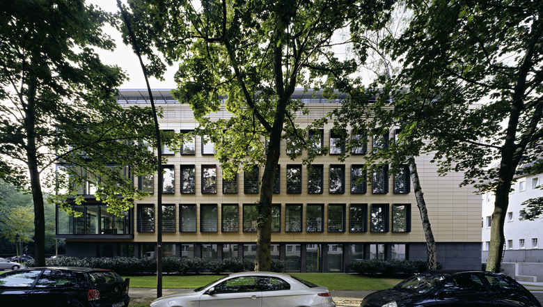 Eine Keramikvorhangfassade, die auch Treppenhäuser und Brüstungen mit durchbrochenen Fassadenelementen überzieht, fasst Altbau und Neubau in einem ruhigen Kubus zusammen. Zur Hardefuststraße als „Nebenstraße“ bestimmt auch künftig die Lochfassade mit einigen wenigen Akzenten das Gesicht des Gebäudes. Eine betonte Ecklösung, große zusammenhängen¬de Fenster und Wandflächen unterstreichen die Ausrichtung zur Volksgartenstraße und dem gegenüberliegenden Park. Das Erdgeschoss bleibt wie bisher dunkel abgesetzt. Ein leichtes auskragendes Dach über dem zurückspringenden Dachgeschoss betont den oberen Gebäudeabschluss. Das Gebäude erhielt eine Tiefgarage mit Doppelparkern, sodass die ehemaligen Garagen und Stellplätze im Innenbereich zugunsten einer gärtnerischen Anlage aufgegeben werden konnten.