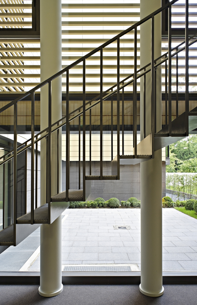 Die Lage ist reizvoll: in absoluter "Grünlage" am Rande der südlichen Innenstadt mit Flair und Kulturangebot. Die vorhandenen Bauten gaben sich relativ spröde und verschlossen. Außerdem schien die Struktur eines klassischen Bürogebäudes in der schmalbrüstigen Version der 50er Jahre wenig zukunftsfähig. Nicht nur aus baurechtlichen Überlegungen sondern auch unter dem Aspekt der Nachhaltigkeit schlugen wir deshalb im Wettbewerb einen Teilabriß und einen ergänzenden Neubau zu dem zu erhaltenden Eckgebäude vor. Während der Altbau auf dem Eckgrundstück auch künftig Sitz der Pensionskasse und des Arbeitgeberverbandes Deutscher Eisenbahnen bleibt, ist der Ergänzungsbau nutzungsoffen konzipiert, weil in solch gehobener innerstädtischen Lage erfahrungsgemäß die Zukunft einer Gebäudetypologie gehört, die beides zulässt: Wohnen und Arbeiten.