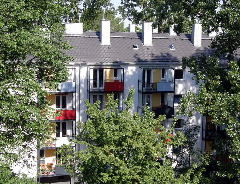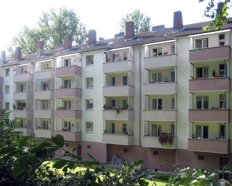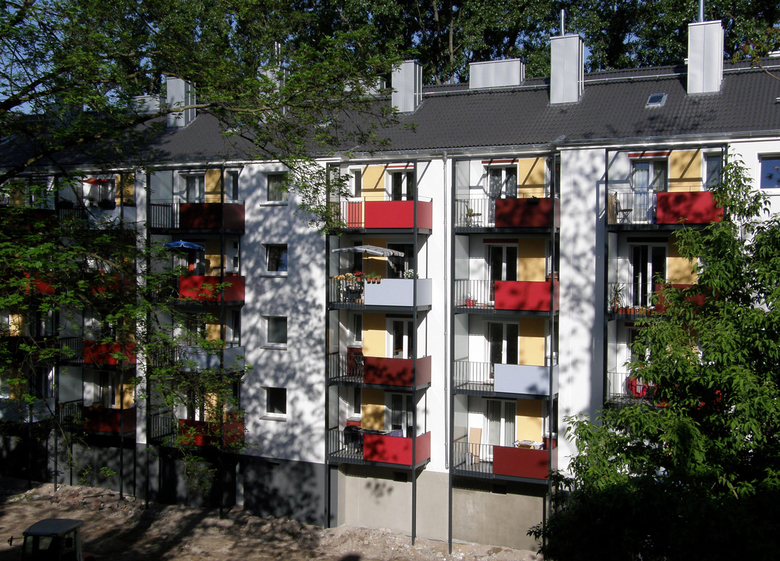 Bei den Wohnhäusern handelt es sich um eine Siedlung von 6 freistehenden Nord-Süd-Zeilen aus dem Bestand der GWG Köln-Nord. Die notwendige energetische Sanierung umfasst die vollständige Erneuerung der Gebäudehülle und richtet sich nach den Förderbedingungen der Kreditanstalt für Wiederaufbau. In diesem Zusammenhang wurden die alten schlecht nutzbaren Balkone abgetrennt und durch vorgefertigte Metallkonstruktionen ersetzt. Durch die unterschiedliche Kombination der Grundfarben rot, Blau und Gelb bei der Gestaltung der Balkonanlagen enstand statt der endlosen Wiederholung von nahezu 300 gleichen Bauelementen ein lebhaftes Spiel leuchtender Farbflächen, das die Wohnanlage trotz der strengen Zeilenstruktur freundlich und einladend erscheinen lässt, ihr einen lockeren und individuellen Anstrich gibt.