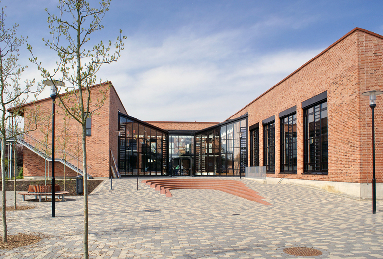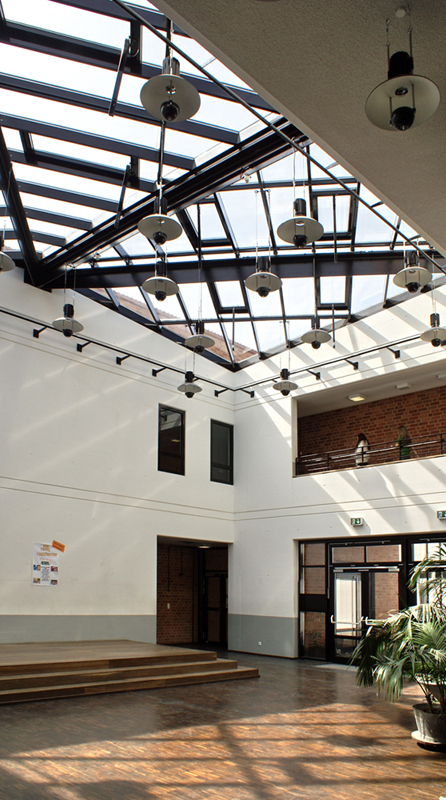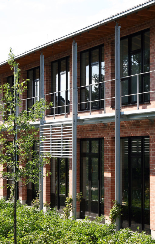 Die Realschule, ein bestehendes Gebäude aus den 60er Jahren, sollte um 5 Klassenräume, eine naturwissenschaftliche Raumgruppe und eine zentrale Halle als Forum und Lichthof erweitert werden. Die Erweiterung, die mit der Halle bis in die Gebäudemitte des Bestandes eingreift, erfolgte bei vollem Schulbetrieb. Der neue Lichthof gibt der Schule mit ihren bisher engen Verkehrsbereichen eine offene, helle Mitte und integriert den Erweiterungsbau in den Bestand. Die eigenständige Architektursprache des 2-geschossigen Neubaus mit geneigter Dachfläche korrespondiert über Material und Farbe mit dem Altbau und verbindet alt und neu zu einer Einheit. Die 2-zügige Grundschule mit integrierter Turnhalle wurde neu gebaut. Turnhalle und 2 Klassentrakte gruppieren sich als Baukörper mit geneigten Pultdächern um eine zentrale gläserne Eingangshalle, die für Schulveranstaltungen genutzt werden kann. Eingangshalle und Schulhof erlauben als räumliche Einheit Festveranstaltungen außen und innen. Ein nachträglich geforderter neuer Ganztag wurde - wegen des beengten Grundstücks - im Untergeschoss mit davor liegender großzügiger Abgrabung realisiert. Beide Schulgebäude wurden mit gleichen Materialien errichtet, roter Ziegel als Vorsatzschale und rote Dachflächen mit Betondachziegeln (Braas novo - Frankfurter Pfanne – ziegelrot), dunkle Metallfenster und verzinkte Laubengänge als Fluchtwege. Die Freiflächen mit Schulgärten und Bäumen integrieren das Gebäudeensemble zu einem Schulcampus.
