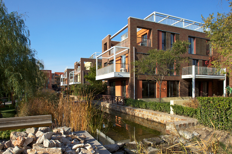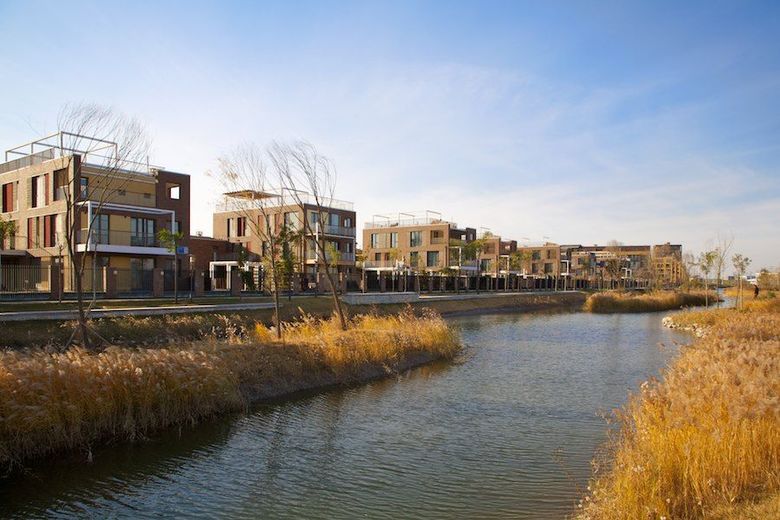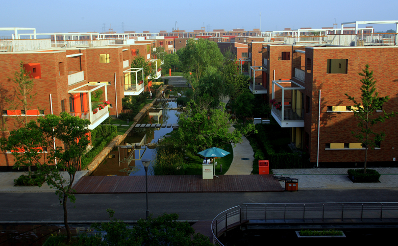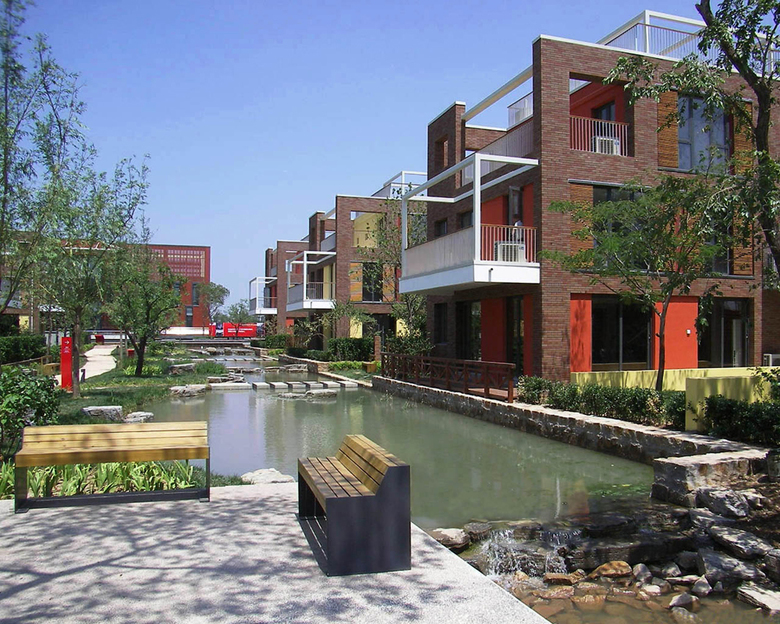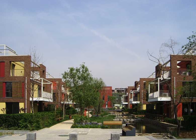 Abweichend von der in China gängigen Praxis der Verdichtung durch eine hohe Geschossigkeit, stützt sich unser Konzept auf eine Gebäudetypologie, welche die chinesiche Tradition des Hofhauses aufgreift. Neben diesen zweigeschossigen Hofhäusern gibt es auch dreigeschossige Reihenhäuser, gestapelte Einfamilienhäuser und Villen, alle mit privatem Außenbereich als Garten oder Dachterrasse. Der Backstein als Fassadenmaterial und eine durchgängige Architektursprache betonen den Zusammenhang innerhalb der Wohnsiedlung, wogegen eine unterschiedliche Farbgebung der Putzflächen die Individualität der einzelnen Quartiere unterstreicht. Der 2- und 3-geschossige Kernbereich wird im Randbereich durch 4- oder 5-geschossige Bebauung, einen 6-zügigen Kindergarten und ein Clubgebäude mit Sport- und Freizeiteinrichtungen ergänzt. Die durchschnittliche GFZ liegt im ersten Bauabschnitt bei 0.8. Die Wohnungsgrößen reichen von 85m² Appartements bis 350m² Villen.