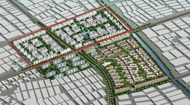 Der zweite Abschnitt steht in Kontinuität zum vorhergegangenen Abschnitt des Society Hill Projektes. Das städtebauliche Konzept und die bestehenden Typologien wurden überarbeitet und durch neue Typologien ergänzt. Im Süden nehmen 5-geschossige Apartmenthäuser die Maßstäblichkeit des ersten Abschnittes auf der gegenüberliegenden Straßenseite auf, während im Norden, zum innerstädtischen Grünzug hin, 10- und 12-geschossige Apartmenthäuser den Abschluss bilden. Als neuer Baustein neben den schon etablierten Typologien der Clusterstruktur im Innern entstehen großzügige Doppelhäuser. Backstein und Putz bleiben die charakteristischen Materialien, die hellere Farbgebung der Gebäude entlang der Nordgrenze unterstreicht deren gesonderte städtebauliche Bedeutung. Die mittlere Dichte von 1,0 liegt um 0,2 über der des ersten Bauabschnittes.