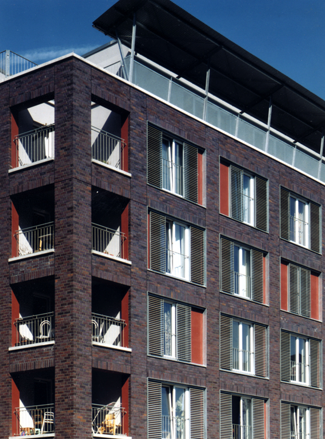 Über die Funktion als Sonnenschutz hinaus geben die Schiebeläden den Bewohnern die Möglichkeit sich in der reizvollen aber auch exponierten Lage eines innenstädtischen Marktplatzes abschirmen zu können, ohne den Kontakt zur Außenwelt völlig zu verlieren.