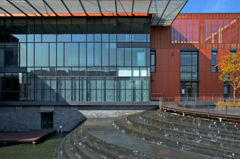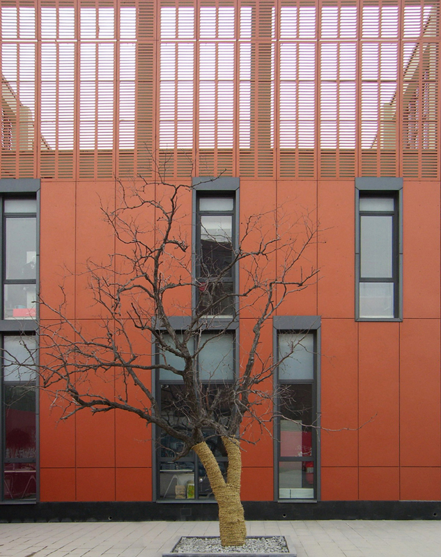 Im Herzen der Siedlung liegt am Haupteingang des ersten Bauabschnittes das Clubgebäude der "Society Hill" Residence. Die kubische Architektur des Gebäudes gibt sich auf den Straßenseiten geschlossen, nach Innen öffnet sich das Gebäude in voller Höhe und gibt den Ausblick auf die Plaza mit der Wasserkaskade und den dahinter beginnenden "Orchard Park" frei. Das multifunktionale Gebäude beherbergt eine Vielzahl von Sportangeboten: Schwimmhalle und Sporthalle sind gestapelt; Fitness und Aerobic; auf dem Dach ein außen liegender Tennisplatz. Neben diesem Schwerpunkt, beinhaltet das Raumprogramm auch ein Foyer für Veranstaltungen und Ausstellungen, eine Lounch, die Verwaltung der Siedlung sowie zahlreiche technische Einrichtungen. Die Fassade aus dunkelroten, teilweise perforierten Trespa-Platten legt sich gleichmäßig über alle Funktionsbereiche, erlaubt direkte oder gefilterte Ausblicke.
