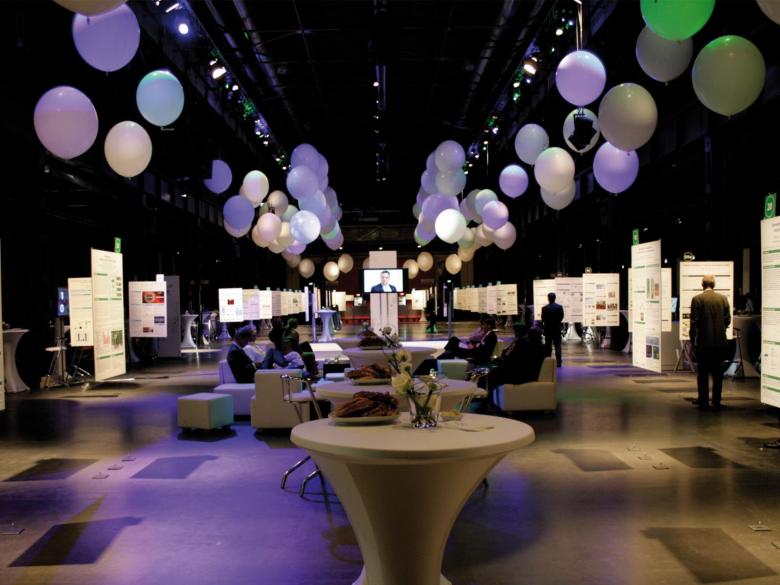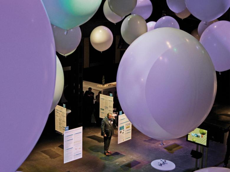 Schwere Themen leicht insziniert – Helium ist das Hauptmaterial, das bei der Umsetzung des Ausstellungsdesigns für den Bayer Science Day 2008 im Palladium Köln kommt. Es entsteht ein Raumkonzept abseits des konventionellen Messebaus. Weder Trennwände, noch Standsysteme sind notwendig, stattdessen werden die etwa 100 Forschungsergebnisse durch bis zu eineinhalb Meter großen Ballons in Szene gesetzt. Unsichtbar befestigt, tragen die mit Helium gefüllten Ballons die Präsentationsflächen. Das Beleuchtungskonzept im Saal verleiht den über 200 weissen Ballons welche mit den Panelen eine lebendige und leichte Raumstruktur schaffen , durch eine wechselnde Farbgebung in den sanften Corporate Colors, eine zusätzliche Dynamik.