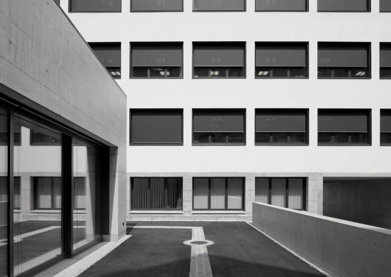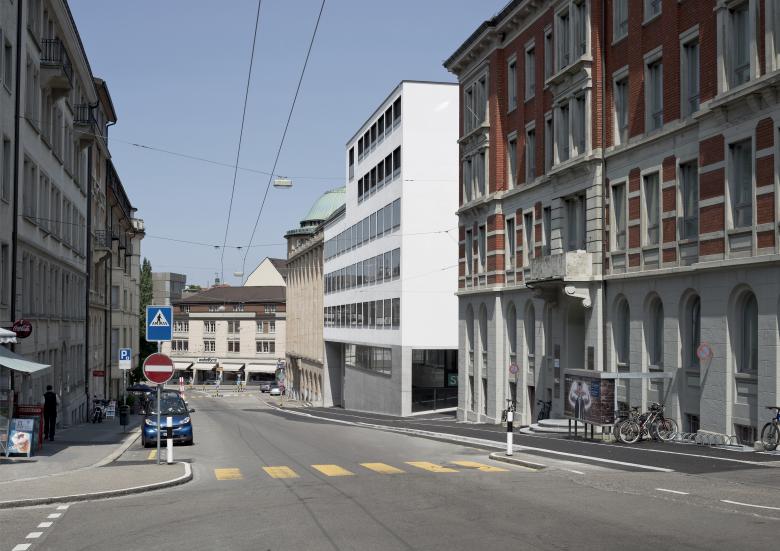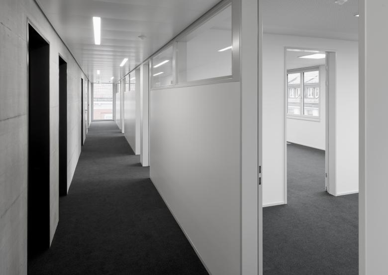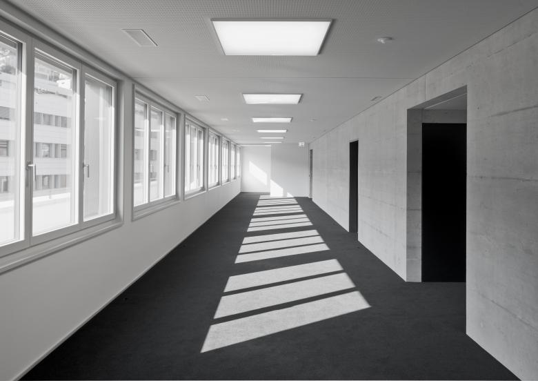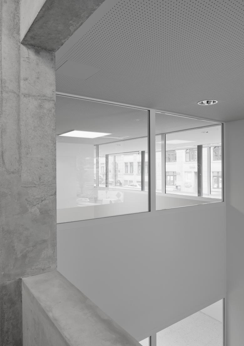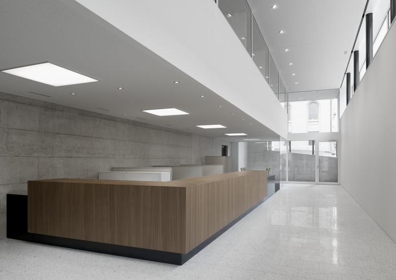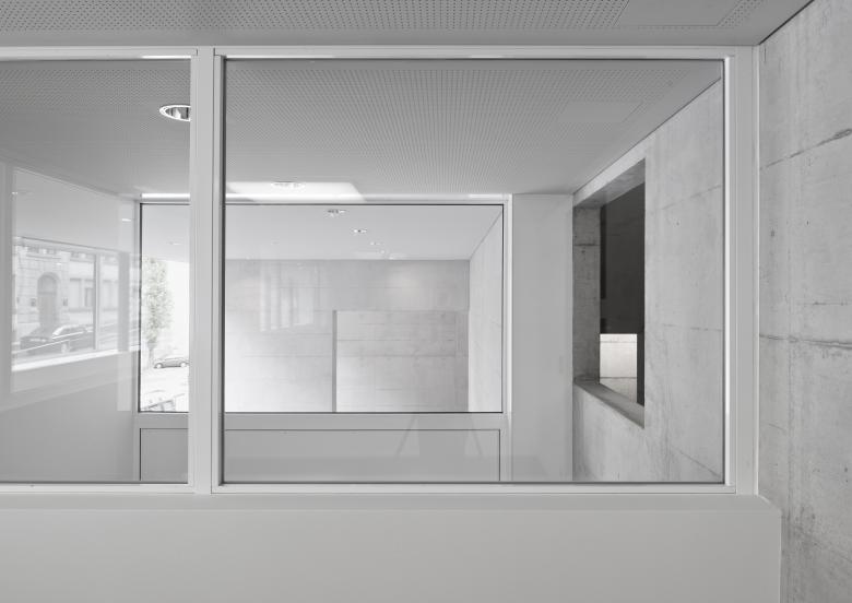 Erneuert sich die Stadt, entstehen Stilbrüche und Friktionen. Verantwortungsvolle Architektur findet dafür klare Konzepte mit einer persönlichen Handschrift. Herrschaftliche Grossbauten prägen das Quartier. Die neue Regionaldirektion erhebt nicht den Anspruch, majestätisch zu wirken wie seine Nachbarn und sich gefällig einzuordnen. Vielmehr betont sie die Bruchstelle im alten Gefüge und lässt damit die verbleibenden Altbauten als Einheit erscheinen. Nicht die Opulenz der Gebäude entspricht sich, sondern die Stärke der ihnen zugrunde liegenden Konzepte. Die gestalterischen Massnahmen sind auf wenige Schwerpunkte reduziert und auf formale Stilelemente wird konsequent verzichtet. Die Formulierung des Gebäudesockels übersetzt ein klassisches Thema in die reduzierte Sprache des Neubaus. Trotz der Mischnutzung aus Büro, öffentlicher Dienstleistung und Wohnen ist die Fassade einheitlich gestaltet, ohne Einbussen in den Raumqualitäten zu bewirken. Feine Anpassungen in der Verglasung gliedern dabei das Gebäude in Obergeschosse und Attika. Auch die Zugänge orientieren sich an den umliegenden Bauten. Sie gewähren durch Einzüge und Durchbrüche Zutritt ins Gebäude und in die Tiefe der Parzelle. Die Eingangshalle verdeutlicht für alle Besucher das Entwurfskonzept: Die Einbettung in den Hang wird hier genauso spürbar wie die puristische Material- und Formensprache und die mehrschichtigen Raumfolgen. Das Gebäude erscheint als einheitlicher Körper, der sich auf das Wesentliche konzentriert.