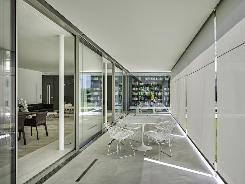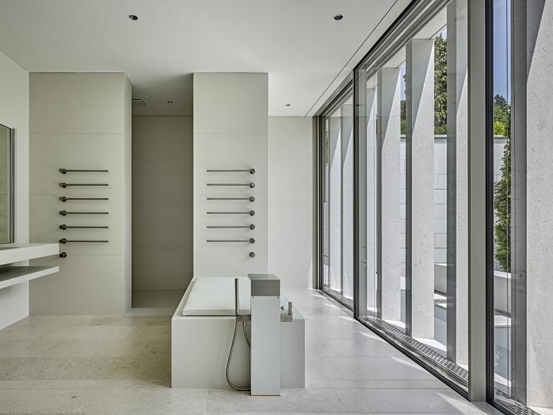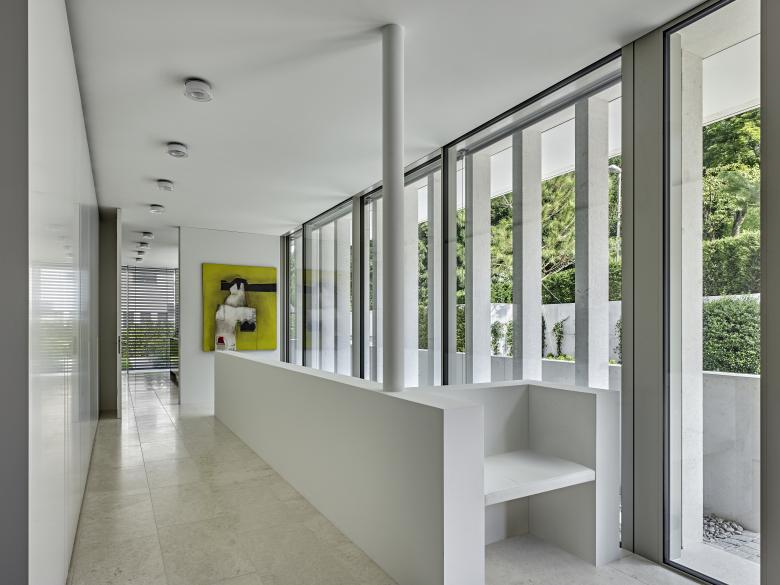 Der Neubau an der Leumattstrasse liegt im Bellerive-Quartier, nahe zum Stadtzentrum von Luzern. Das Grundstück in leicht erhöhter Lage, am Fusse des Villenquartiers, bietet einen fantastischen und einmaligen Ausblick auf den Vierwaldstättersee, die Innerschweizer Alpen mit dem Hausberg Pilatus und der Stadt Luzern. Das eingeschossige Winkelhaus mit der freistehenden Doppelgarage ist über den nordseitigen Hof erschlossen, welcher hangseitig durch helle Sichtbetonwände gefasst wird. Die Trennung in den Tag- und Nachtbereich erfolgt klassisch über die beiden Gebäudeschenkel. Als Gelenk dient die grosszügige und lichtdurchflutete Eingangshalle, mit dem offenen Abgang ins Untergeschoss. Der Wohnraum mit der Breitseite gegen Süden eröffnet den Weitblick in die Ferne, rückwärtig angebunden ist die kompakte Küche. Der Schlaftrakt mit den Nasszellen fasst einseitig den Aussenraum und bildet gleichzeitig das Rückgrat der Anlage. Die geschlossenen Wandelemente, verkleidet mit Naturstein, verankern den grosszügig verglasten Kubus, welcher mit den vorgelagerten hellen Betonplatten leicht über dem Terrain schwebt. Vertikale Natursteinstelen, verwendet als Filterschicht, rhythmisieren die stringente Fassade. Mit dem stützenfreien und weit ausladenden Vordach erfährt der Wohnraum eine räumlich attraktive Erweiterung. Filigrane Stützen tragen das massive Hauptdach und lassen die Räume fliessen. Mit der reduzierten Materialwahl, der durchgängige Bodenbelag ist aus demselben Naturstein wie die Fassade, der klaren Formensprache und der präzisen Raumfassung, entstand eine qualitätsvolle und grosszügige Wohnatmosphäre. Unterschiedliche und artenreiche Bepflanzungen kontrastieren mit der bestehenden Blutbuche im Westen und zonieren die Gartenanlage. Der befestigte Sitzplatz im Südwesten bietet zusammen mit der Dachterrasse, erreichbar über die elegant geschwungene Wendeltreppe, abwechslungsreiche und attraktive Aufenthaltsbereiche im Aussenraum.