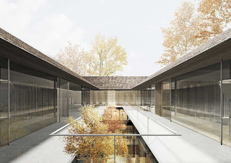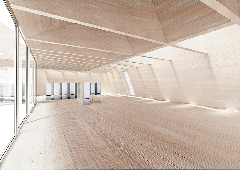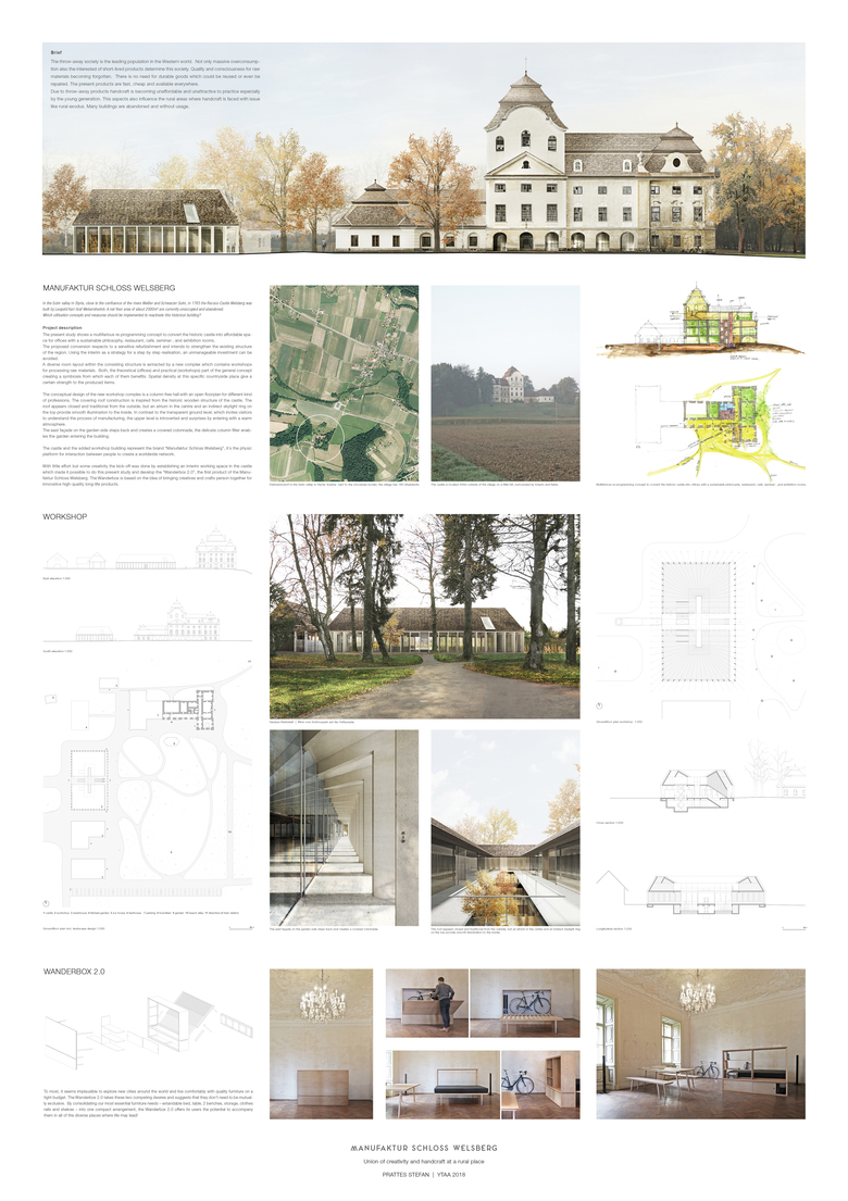 The present study shows a multifarious re-programming concept to convert the historic castle into affordable space for offices with a sustainable philosophy, restaurant, café, seminar-, and exhibition rooms. The proposed conversion respects to a sensitive refurbishment and intends to strengthen the existing structure of the region. Using the interim as a strategy for a step by step realisation, an unmanageable investment can be avoided. A diverse room layout within the consisting structure is extracted by a new complex which contains workshops for processing raw materials. Both, the theoretical (offices) and practical (workshops) part of the general concept creating a symbiosis from which each of them benefits. Spatial density at this specific countryside place give a certain strength to the produced items. The conceptual design of the new workshop complex is a column-free hall with an open floorplan for different kind of professions. The covering roof construction is inspired from the historic wooden structure of the castle. The roof appears closed and traditional from the outside, but an atrium in the centre and an indirect skylight ring on the top provide smooth illumination to the inside. In contrast to the transparent ground level, which invites visitors to understand the process of manufacturing, the upper level is introverted and surprises by entering with a warm atmosphere. The east façade on the garden side steps back and creates a covered colonnade, the delicate column filter enables the garden entering the building. The castle and the added workshop building represent the brand “Manufaktur Schloss Welsberg”, it´s the physic platform for interaction between people to create a worldwide network. With little effort but some creativity the kick-off was done by establishing an interim working space in the castle which made it possible to do this present study and develop the “Wanderbox 2.0”, the first product of the Manufaktur Schloss Welsberg. The Wanderbox is based on the idea of bringing creatives and crafts person together for innovative high-quality long-life products.