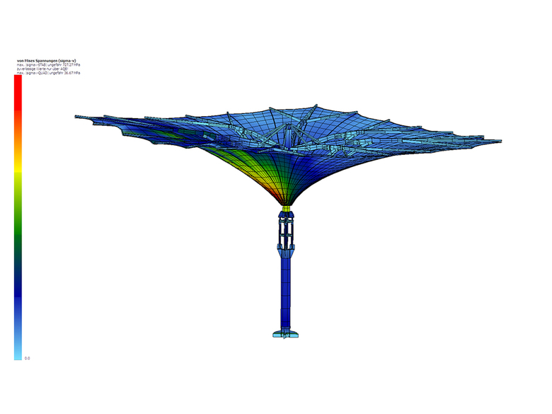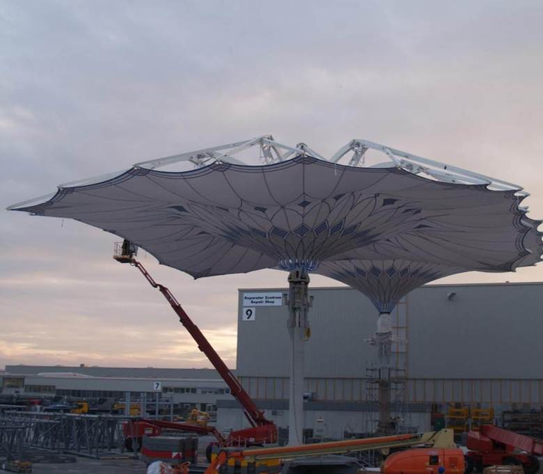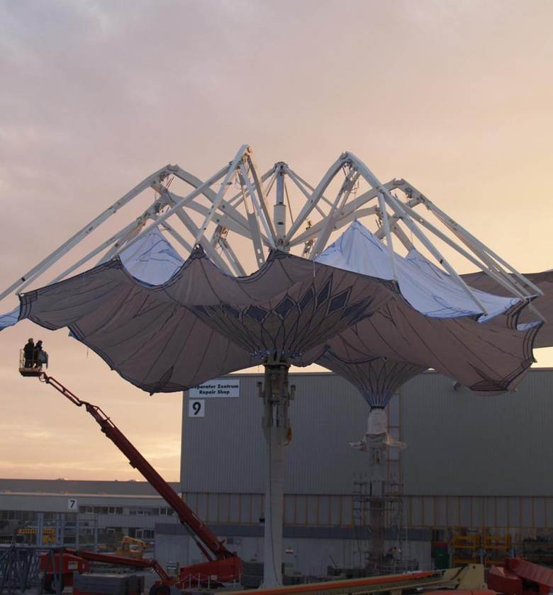 260 Schirme überspannen die Außenflächen der Prophetenmoschee in Medina. Insgesamt überdachen sie eine Fläche von 145.000 m². Im aufgespannten Zustand haben die Schirmkonstruktionen eine Höhe von 21,70 m. Die vorgespannten Schirmmembranen messen je 26 x 26 m.