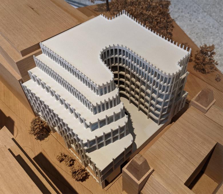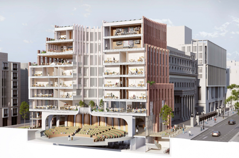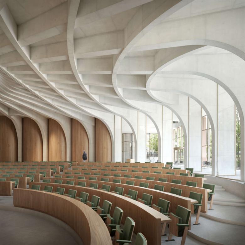 Facing the historic Lincoln's Inn Field, the north side of the building is expressed with a symmetrical and balanced façade in the manner of a palazzo. The façade is subtly curved in a soft gesture of urban embrace. The stepped massing, rising to nine stories, emphasizes rootedness and heft without overly imposing on its surroundings. South-facing outdoor terraces at multiple levels are capable of supporting planting, encouraging biodiversity and access to nature throughout the building for students and faculty to enjoy.