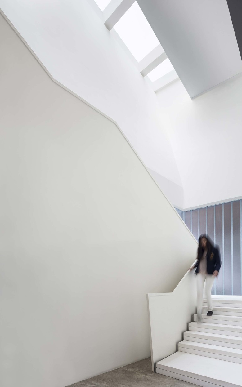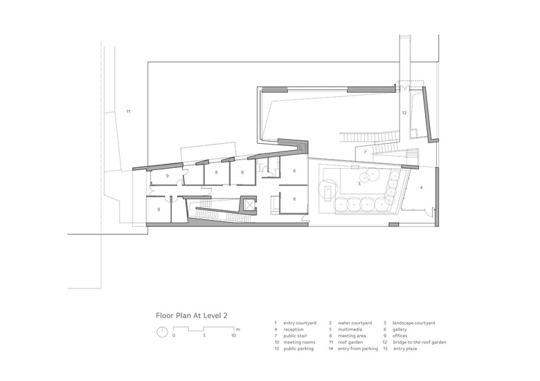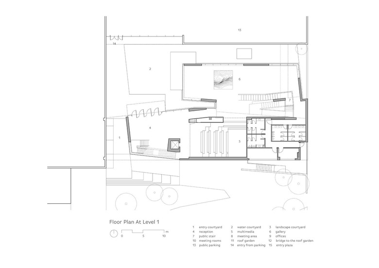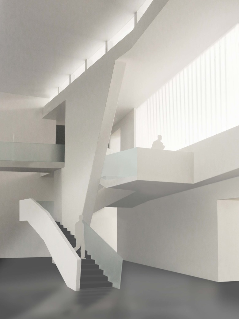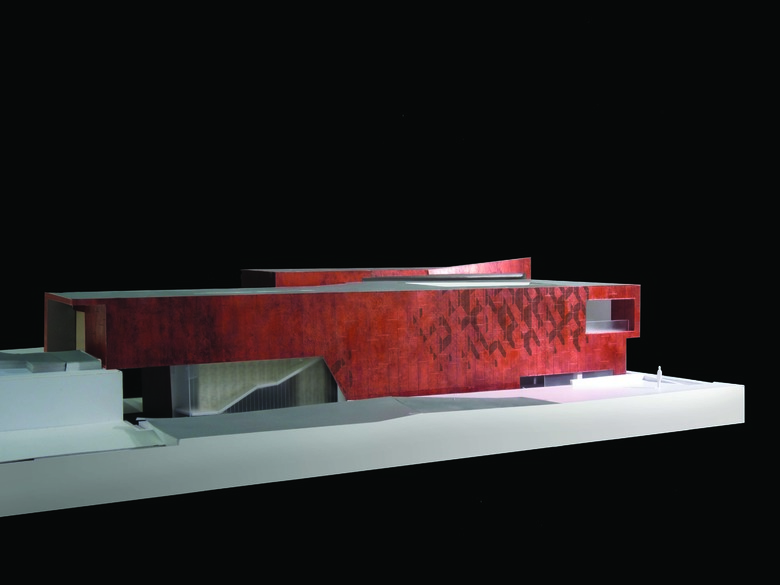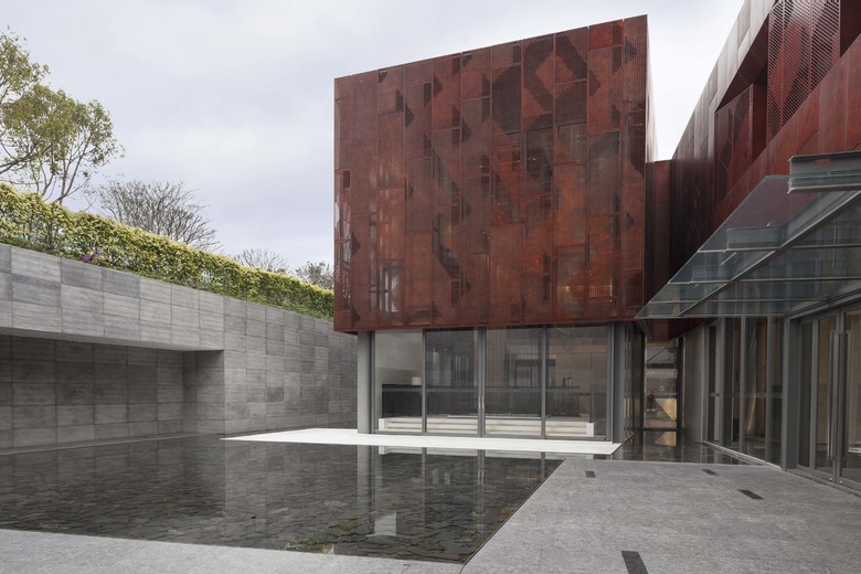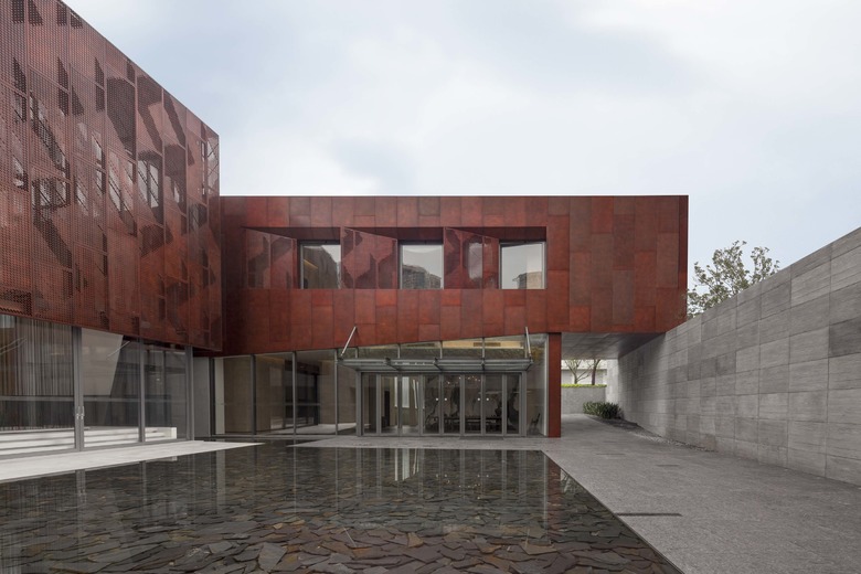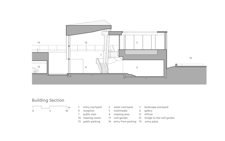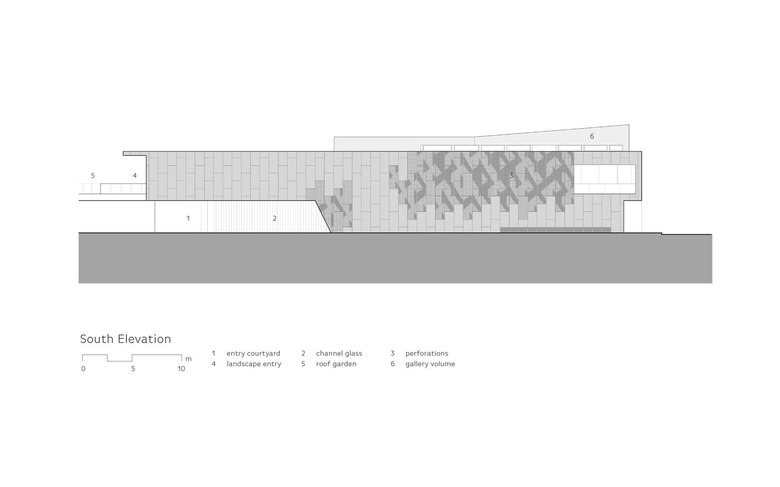 The project is designed as a contemplative sequence of spaces, beginning with a planted landscape area to the south of the building which leads to a stone courtyard and reflecting pool, from which the building’s main entrance is accessed. This sequence continues into the interior of the building, starting with a reception area and multimedia space, after which visitors enter the gallery volume, which features a sculptural concrete shell and a perforated copper façade that allows light to penetrate the space.