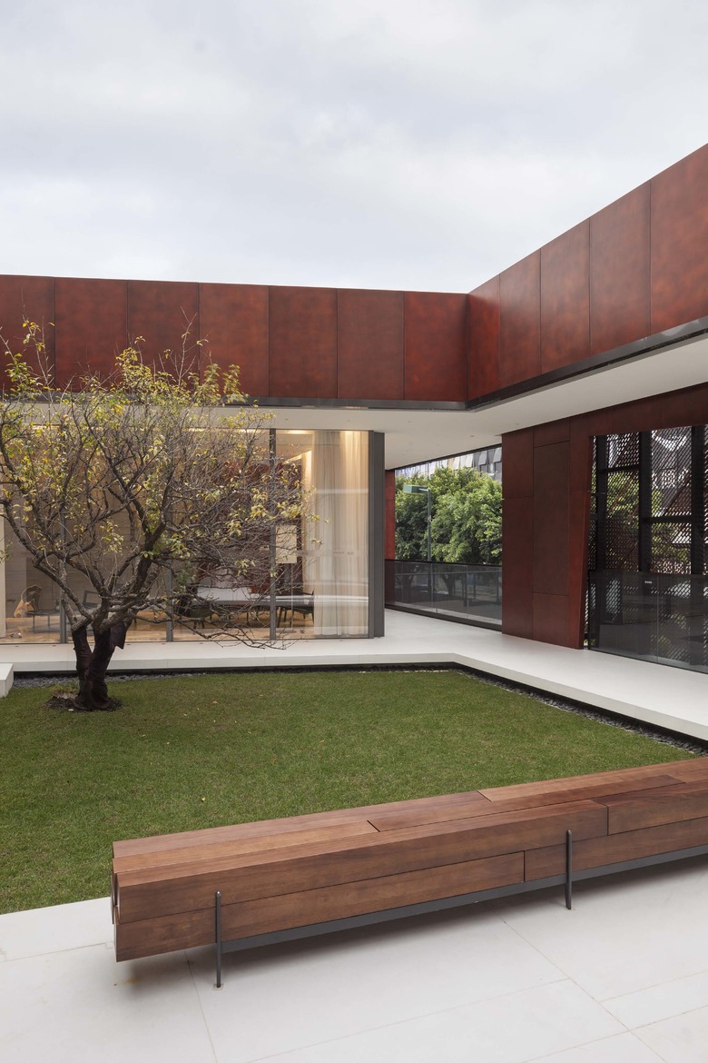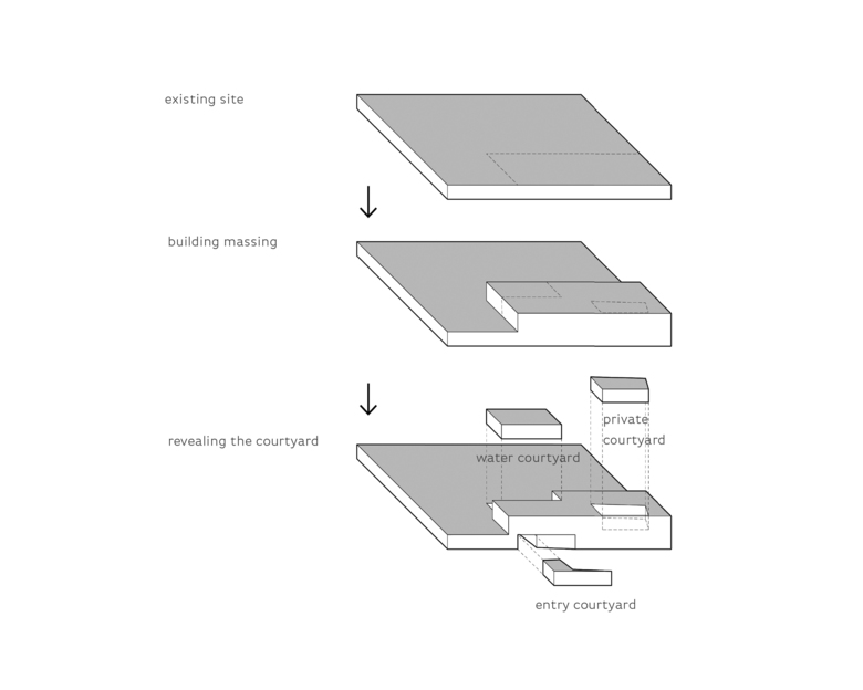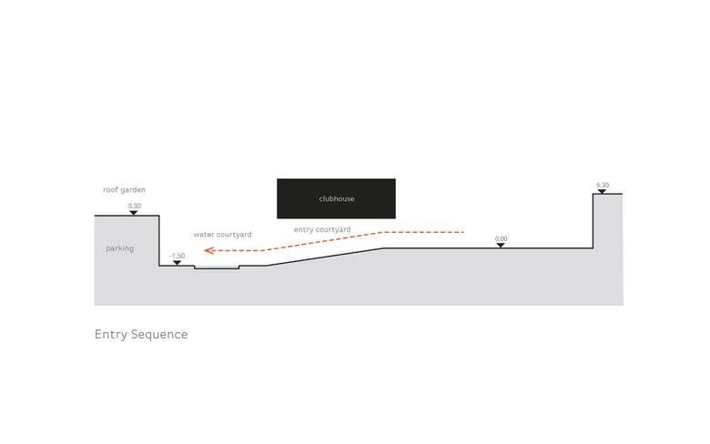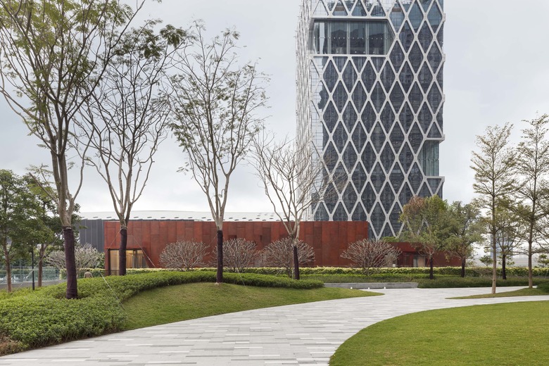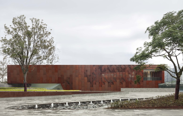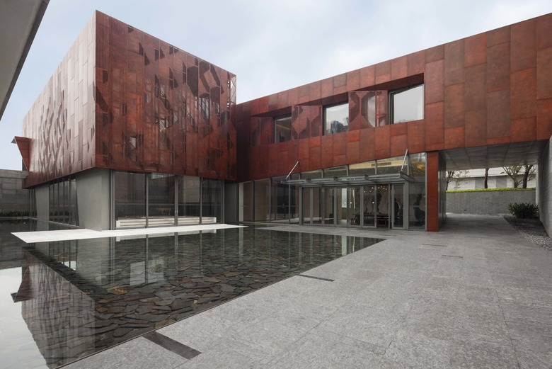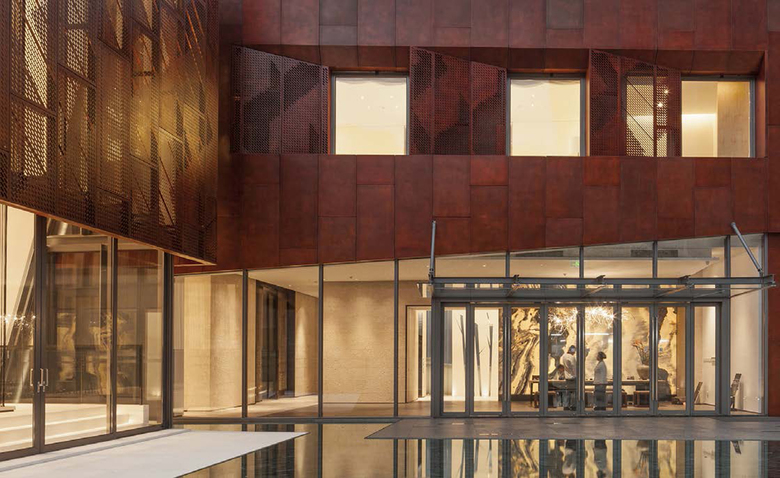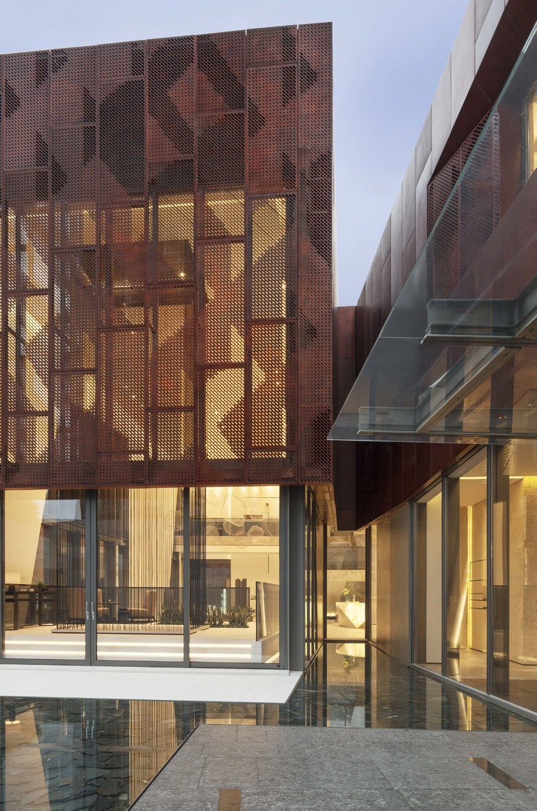 This building, a private clubhouse and gallery for high-end residential development in the Shenzhen Bay area, is conceived as a composition of two intersecting masses. The first volume, located to the north, is an open, double height gallery space with generous light and views. The second volume, a longer and lower mass to the south, incorporates most of the building program and is defined by a more solid façade that promotes a sense of privacy and dignified calm. The two masses are unified by a perforated copper façade that lends warmth to the building, controls views and light via perforations, and adds visual texture to the project’s refined massing.