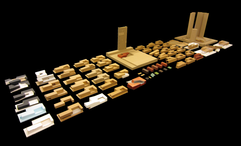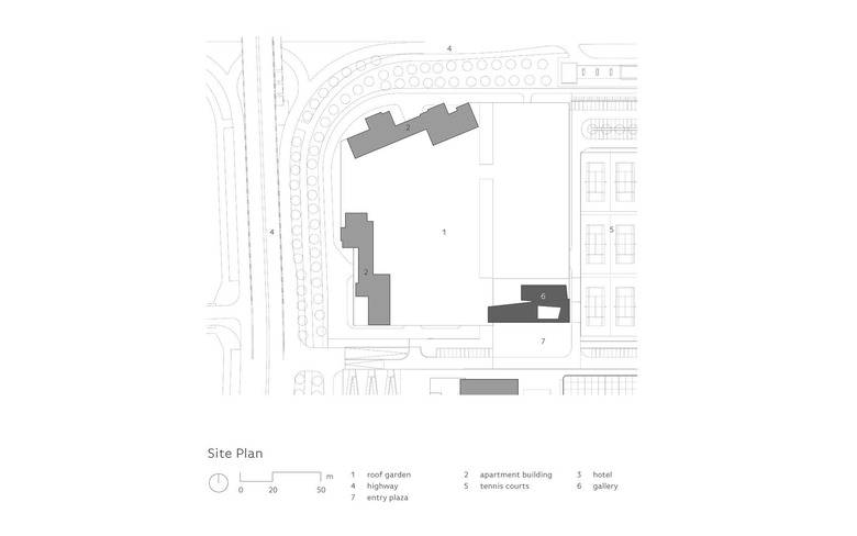 A sculptural staircase and viewing platform, located between the two main volumes, allows visitors to either exit the building via a bridge into a park to the north or to continue south to a private courtyard located on the building’s second floor. This courtyard, defined by translucent glass walls and quiet plantings, extends the interaction between the building and the site by drawing the landscape further into the building. After the courtyard, visitors are led to a suite of contract signing rooms which enjoy views of the residential towers to the north of the site. From this point, visitors can exit the building into a landscaped park, concluding the experience of the project.
