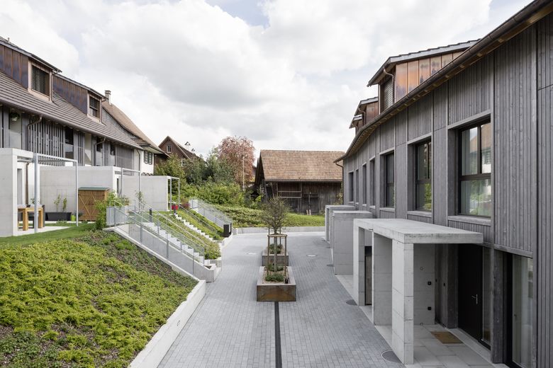 Nach einem Studienauftrag wurde der Bautyp auf Reihenhäuser festgelegt. In der weiteren Bearbeitung war wichtig, die besonderen Gegebenheiten des alten Dorfkerns und die Kernzonenbestimmungen einzubeziehen.