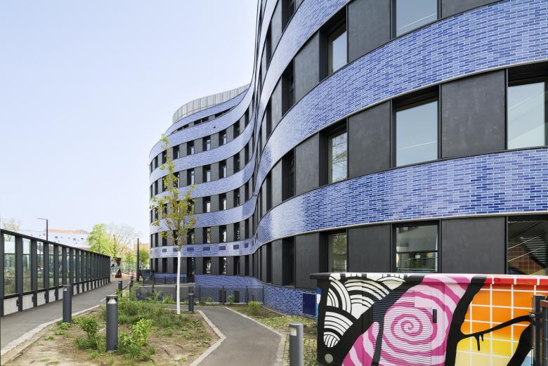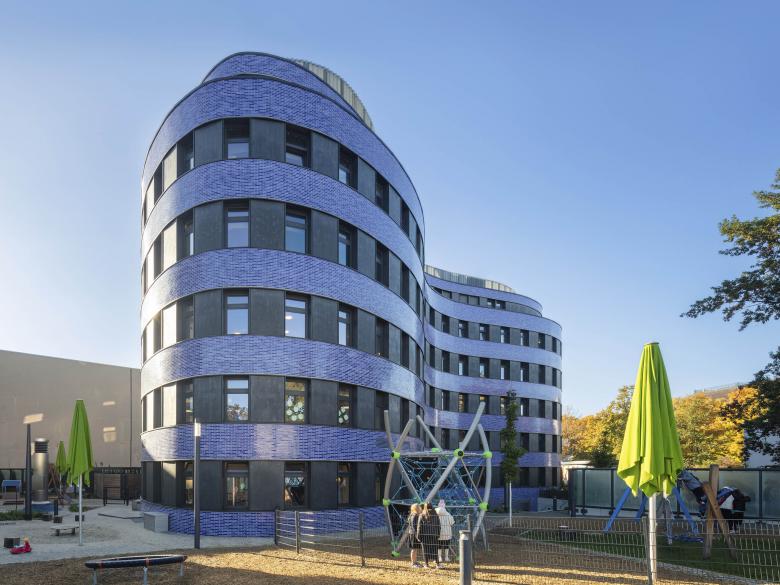 Formal und stilistisch finden sich in der Gestaltung des Schulbaus wieder Bezüge zum benachbarten Familien- und Kulturzentrum: So lässt sich ein farblicher Zusammenhang zwischen der changierend, himmelblau / nachtblau-violett glasierten, hinterlüfteten Klinkerfassade des Schulneubaus und dem blau-weiß-verglasten Eingangsportal zum jüdischen Kulturzentrum im vorderen Grundstücksteil entdecken.