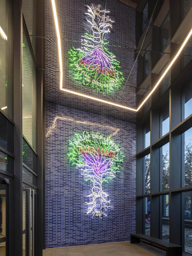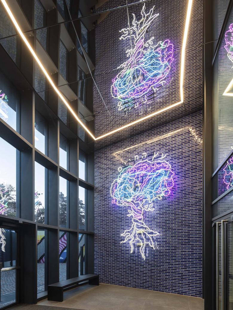 Der Haupteingang der Schule ist vom Straßenniveau aus barrierefrei zugänglich. Seine Wände zieren zwei kabbalistische Lebensbäume, Lichtinstallationen der Berliner Künstlerin Anna Nezhnaya. Die beiden Bäume, die die Menschen am Eingang zum Campus in leuchtenden Farben begrüßen, sind weniger schematisch, sondern vielmehr malerisch-poetisch gestaltet. Als Eiche und Olivenbaum stehen sie für die beiden Länder Deutschland und Israel.