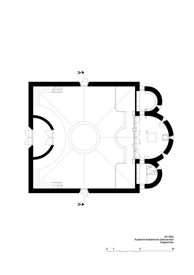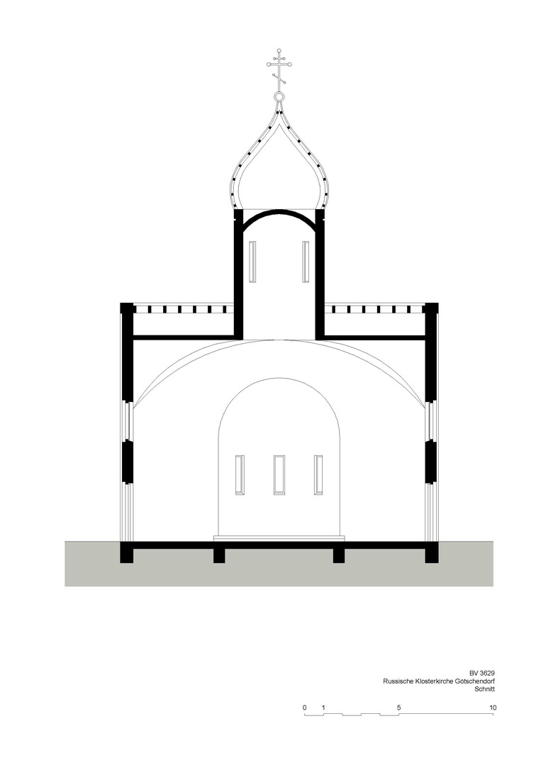 Der Kirchenbau befindet sich seitlich im vorderen Teil des Grundstückes und wird damit zum neuen, sinnstiftenden Blickfang der Anlage. Er ist trotz russisch-byzantinischer Bautradition mit Kuppel, runder Laterne und Zwiebelhaube von berührender Schlichtheit, wobei die Formen modifiziert und vereinfacht wurden. Das viergiebelige, sockellose Volumen hat einen quadratischen Grundriss mit einer 26 Meter hohen Turmspitze und einer Wandlänge von 17 Metern sowie zehn Metern lichter Höhe. Im Bereich des Altarraums ist der Grundriss um drei Apsiden erweitert.