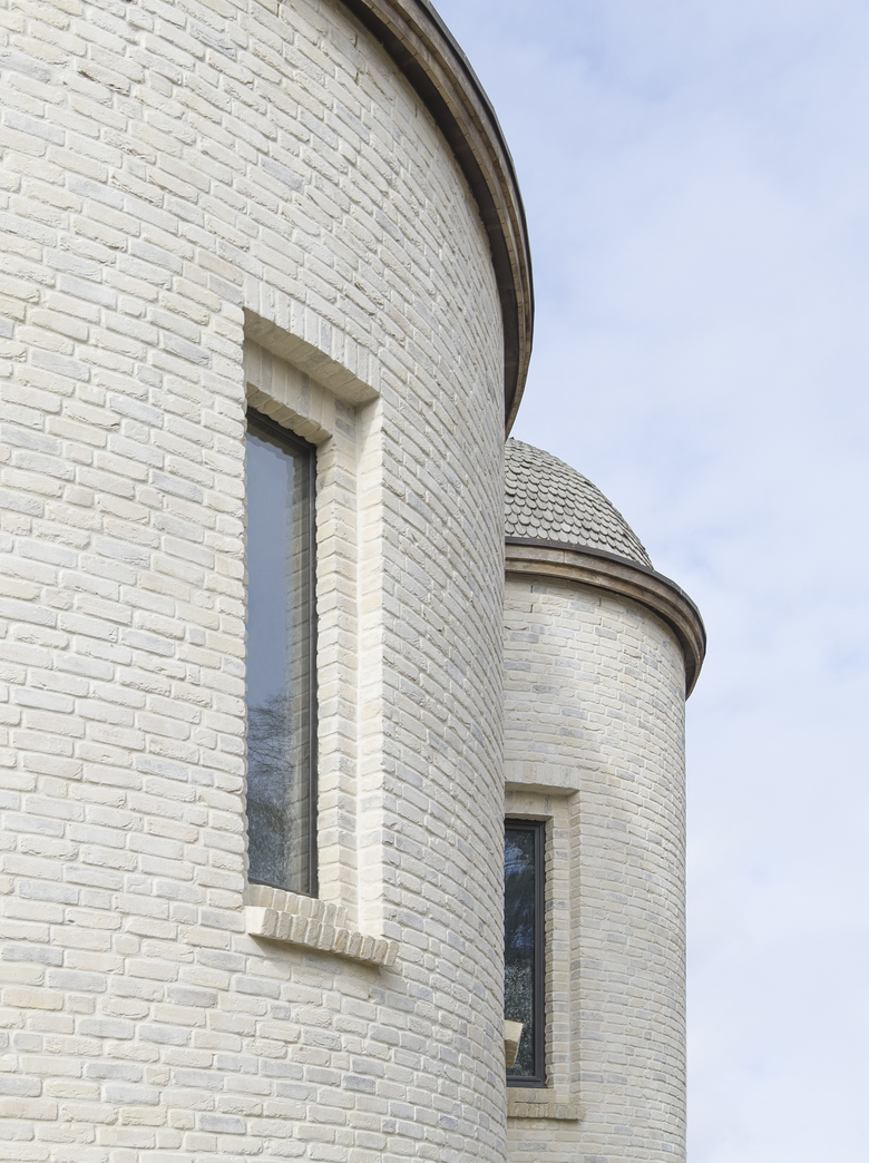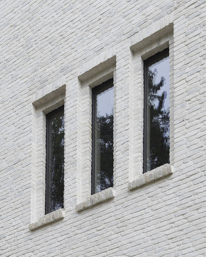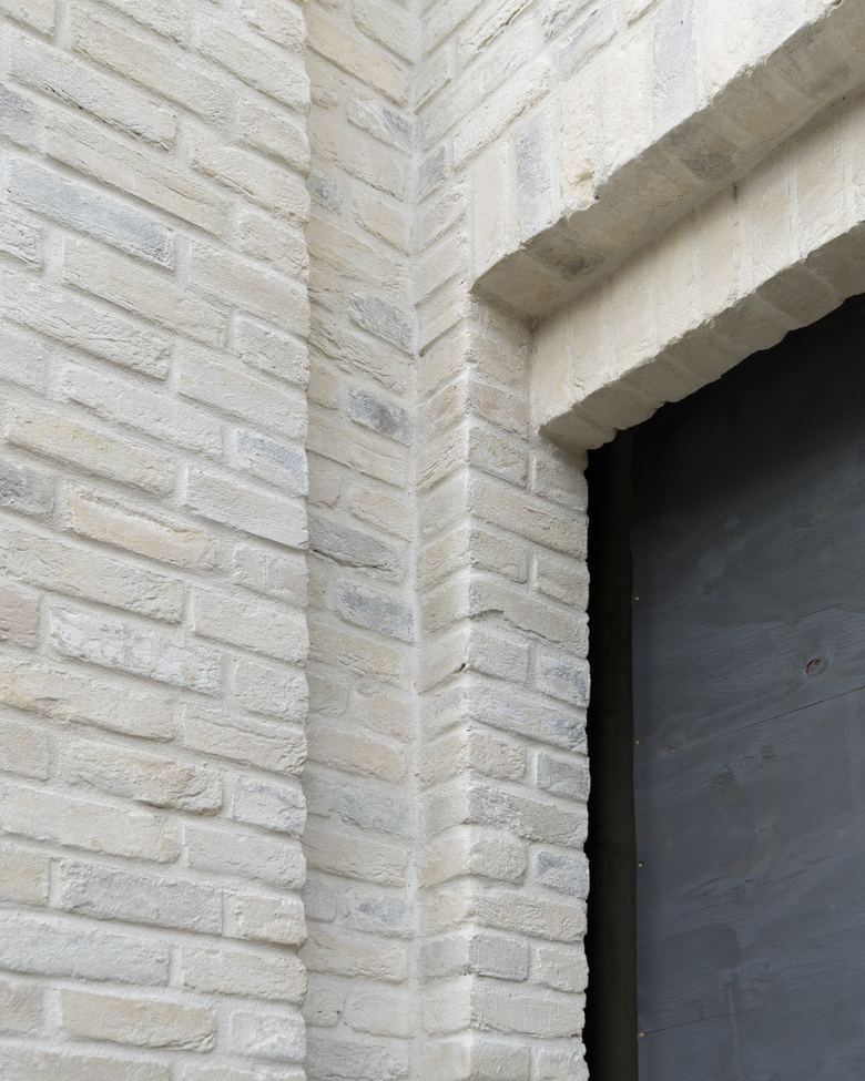 Die Kirche setzt keinen Kontrast zu den Nachbargebäuden, sondern fügt sich ohne große Gesten in die Anlage ein. Der minimale Einsatz an Details setzt Akzente an der Fassade. Ziegelsteine in heller Palette leicht unterschiedlicher Tönung wurden geschlemmt, wodurch je nach Lichteinfall ein silberner oder goldener Schimmer zu entstehen scheint. Auch die hellgrauen Holzschindeln der Dachdeckung wirken im Sonnenlicht leicht metallisch. Die gebogenen schmalen Traufgesimse aus Holz unterstreichen die Rundungen der Apsiden. Das zweifache Gewände um den Haupttürbogen, Fensterfaschen oder ein gestaffelter Kämpfer sowie Lisenen an der Hauptfassade bringen dezente Tiefe und Bewegung in das sonst unscheinbare Erscheinungsbild der Fassade. Schmale, vertikale Fenster reduzieren den Außenbezug und betonen den sakralen Charakter.