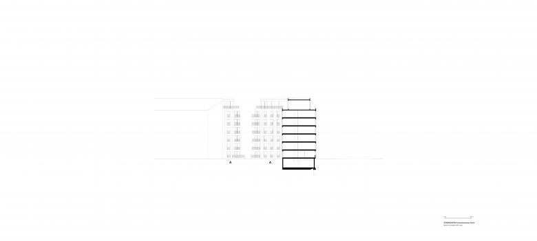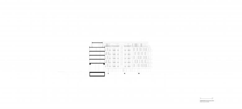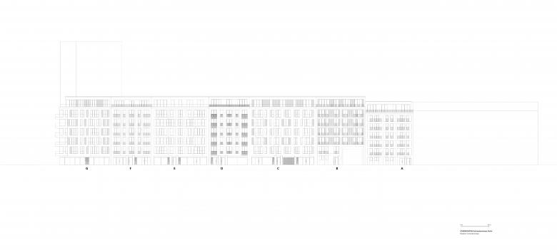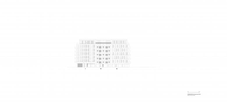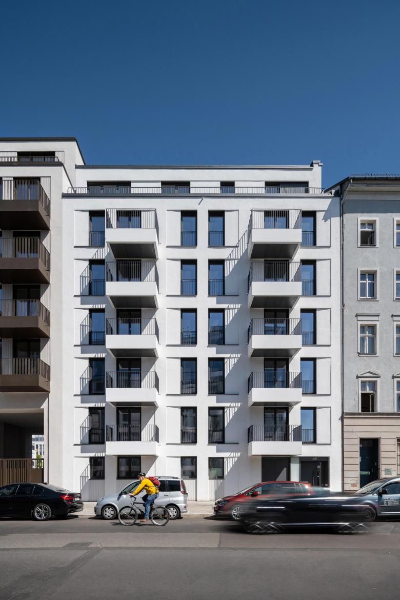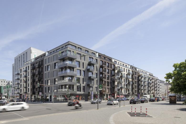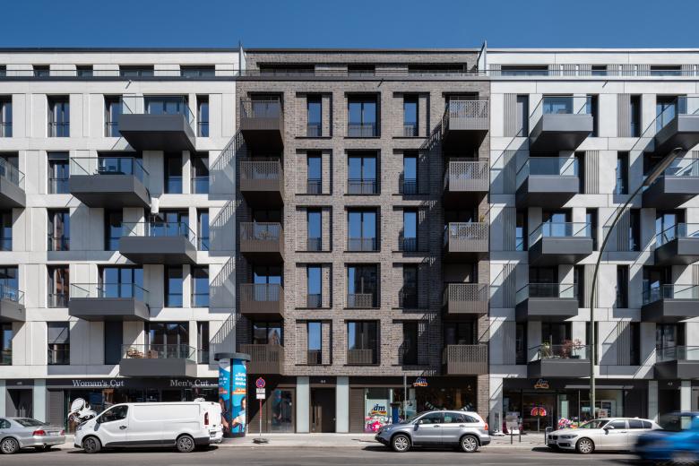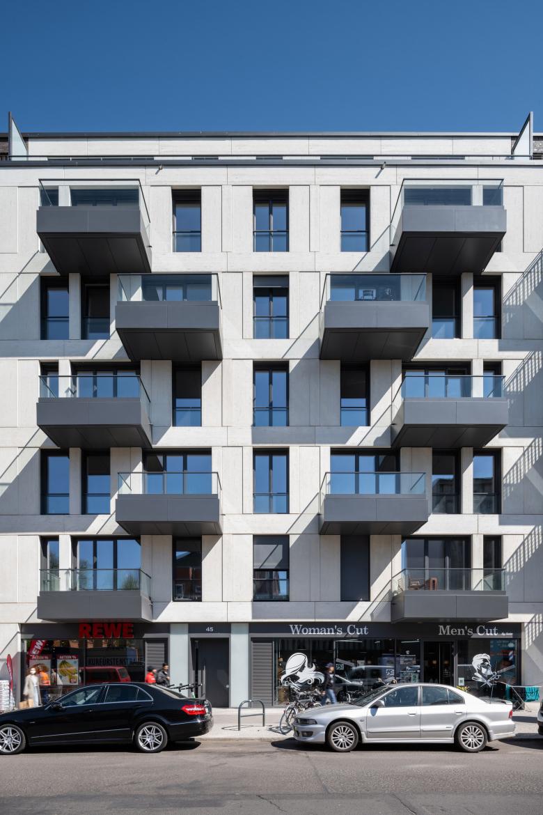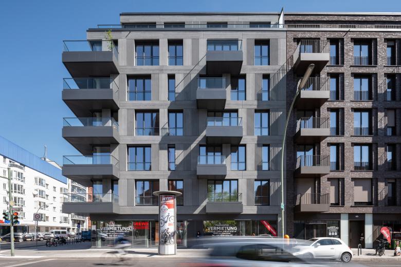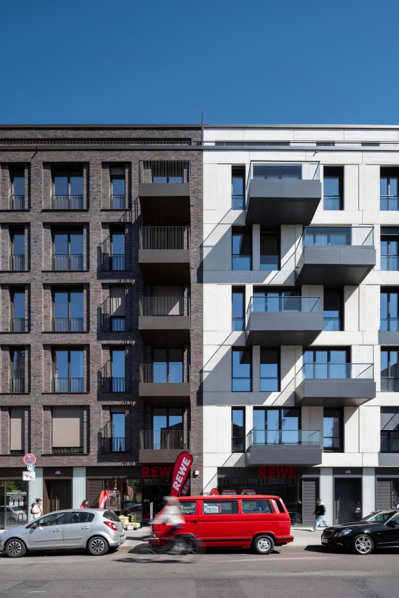 Architekturbeton und Mauerwerk sind die Ausgangsmaterialien der Fassadengestaltung und wurden je nach Gebäude unterschiedlich ausgeführt. Die rauen Strukturen einer Beton-Holzschalung wechseln sich mit glattem Sichtbeton und fein geschliffener Travertin-Optik ab. Bei der Klinkerverkleidung wurden wiederum unterschiedliche Farb- und Mustervariationen verwendet. Die Gestaltungsvielfalt der Fassaden passt perfekt in das abwechslungsreiche Straßenbild. Die Wahl der einzelnen Materialien für die facettenreichen Fassaden ist eine Referenz an das architektonische Erbe Berlins: Ziegel, Mauerwerk in Farb- und Mustervariationen verweisen auf Kirchen- und Industriebauten, kannelierter Putz auf die Gründerzeit, Sichtbeton und Glas sprechen die Sprache des heutigen Berlins. Die verputzten Fassaden im Innenhof zeigen mit Farben und Oberflächen eine ähnliche Gestaltung wie die Straßenfassaden.