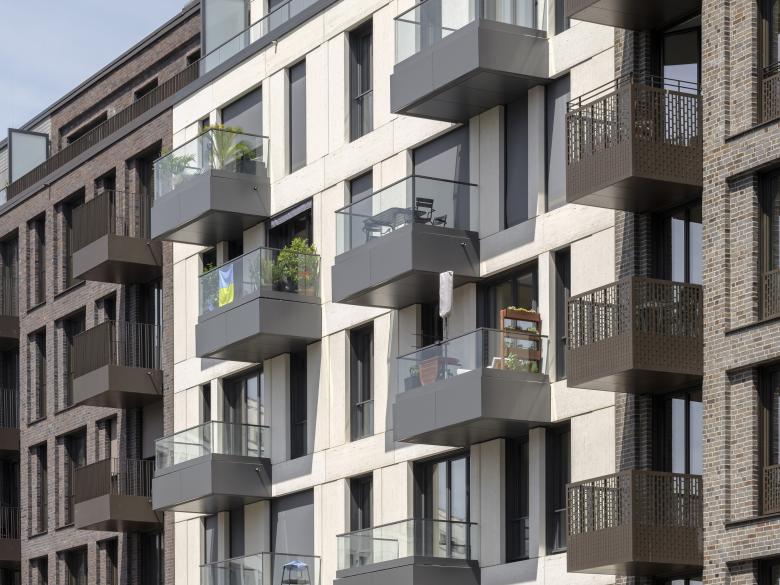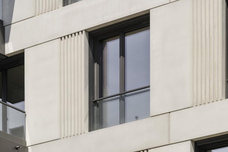 Fensterfaschen und Blindfensterfelder wurden zusätzlich durch Rücksprünge, Riffelungen oder Farbakzente betont und aufgelockert. Mit unterschiedlichen Ausführungen der Balkone wird das lebendige Fassadenbild intensiviert. Glasbrüstungen wurden passend zu Betonoberflächen verwendet, individuelle Metallgeländer wurden für Mauerwerkfassaden vorgesehen.