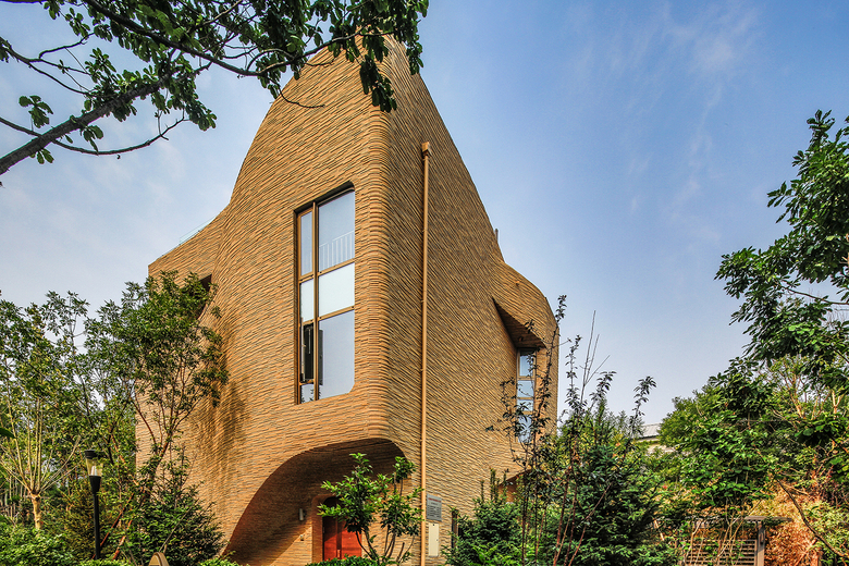 The addition of these facade features further connects the experience of the architecture to the surrounding landscapes. Through slight transformations in shape - created by the slight twisting of the curved surfaces of the façade - rhythm in the elevations is created which adds continuity and further unifies the architecture with the landscape. In addition the clay color of the facade fosters this intrinsic connection between built and natural environment. The facade cladding is made from recycled stone produced from powdered stone and is applied to the facade in a contemporary fashion. This enables the realisation of the fluent curves, while permitting the necessary tolerances for the local construction team.