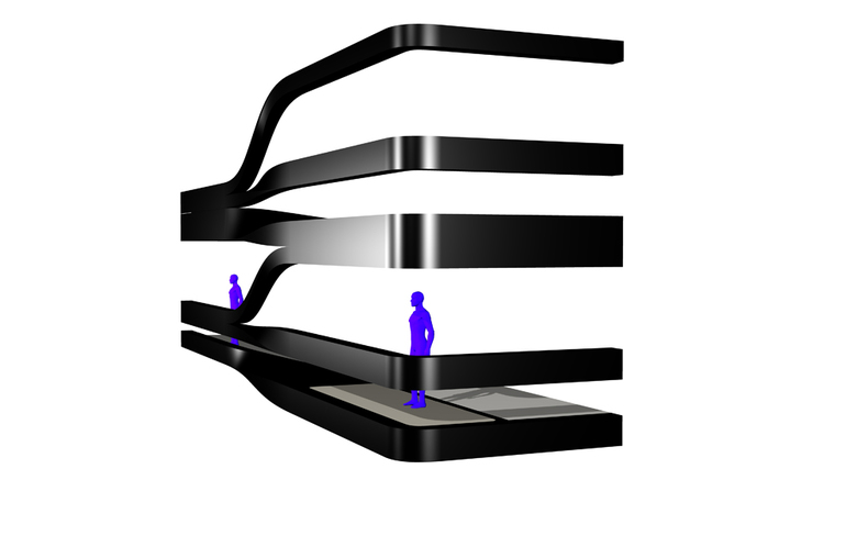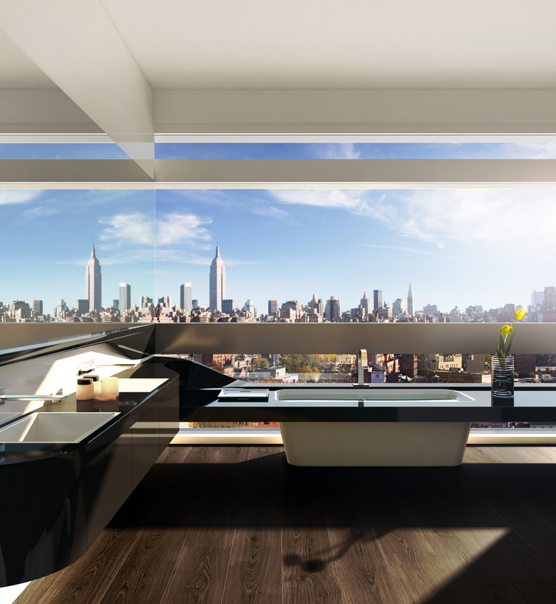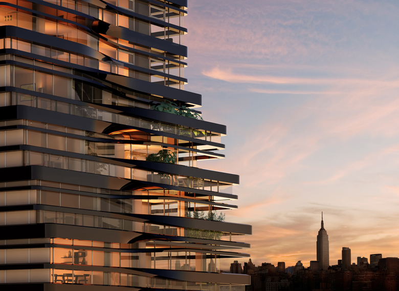 The exterior geometries relate directly to the building’s Interiors. The horizontal and mutable qualities of the facade continue inside the building and translate into broad horizontal spatial arrangements; curved walls that echo the soft corners of the ribbons outside and shift to allow for maximum flexibility in the use of rooms; balconies shaped to loop residents’ movements back indoors; and highly-engineered, custom features and fixtures for kitchens and bathrooms which echo the shapes formed by the facade treatment. All interior elements are conceived to maximize light and the exceptional views over Manhattan.